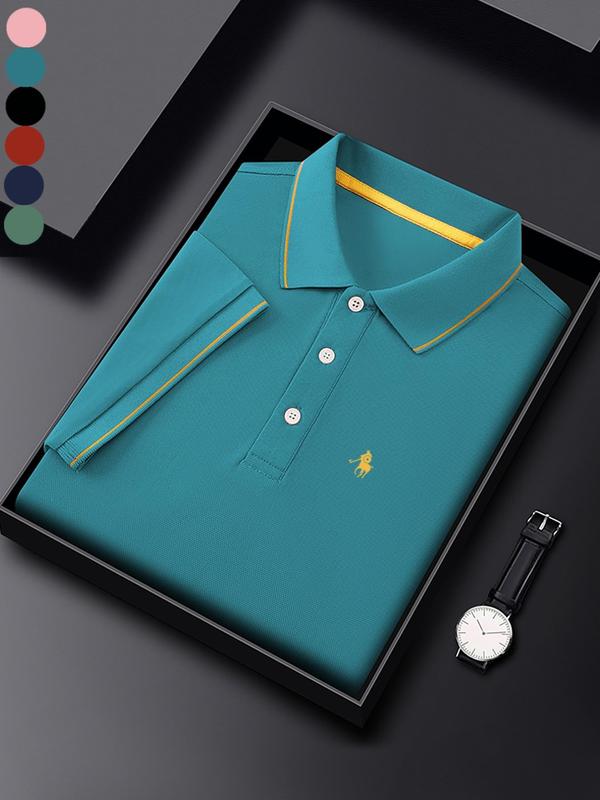 Men's Regular Fit Letter Embroidery Contrast Trim Polo Shirt, Casual Short Sleeve Half Zip Top for Summer, Fashion Men's Clothes for Daily Wear, Gamis, Solid Zipper Polo