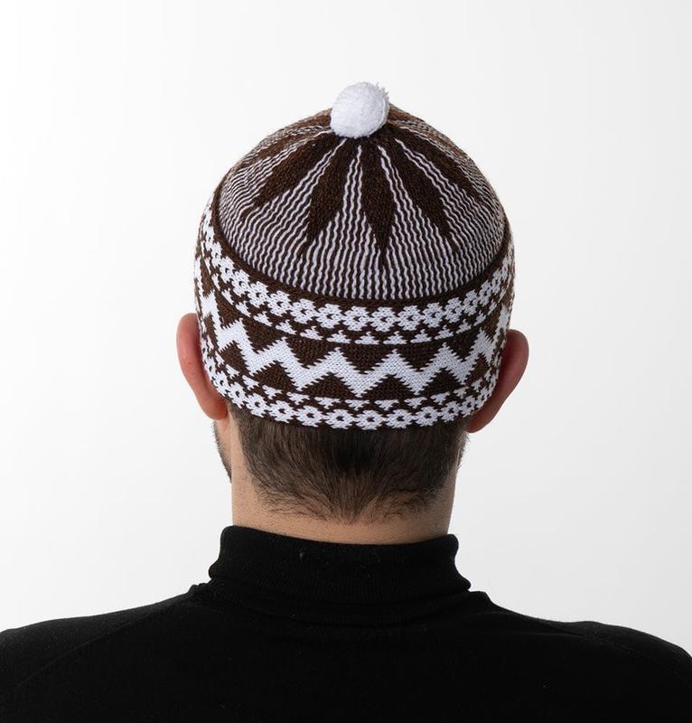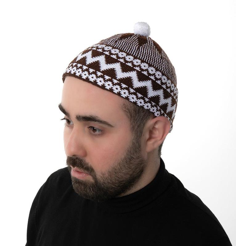 Men's Premium Islamic Haji Knitted Kufi - Brown Available in a range of colors, this Turkish inspired kufi is soft, traditional making it perfect for a prayer hat, beanie, or skull cap! Features an Anatolian motif inspired design knitted into the cap around the brim and in the middle of the crown.