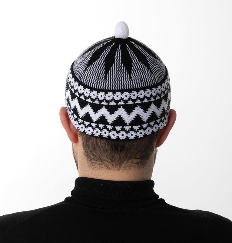 Men's Premium Islamic Haji Knitted Kufi - Black Available in a range of colors, this Turkish inspired kufi is soft, traditional making it perfect for a prayer hat, beanie, or skull cap! Features an Anatolian motif inspired design knitted into the cap around the brim and in the middle of the crown.