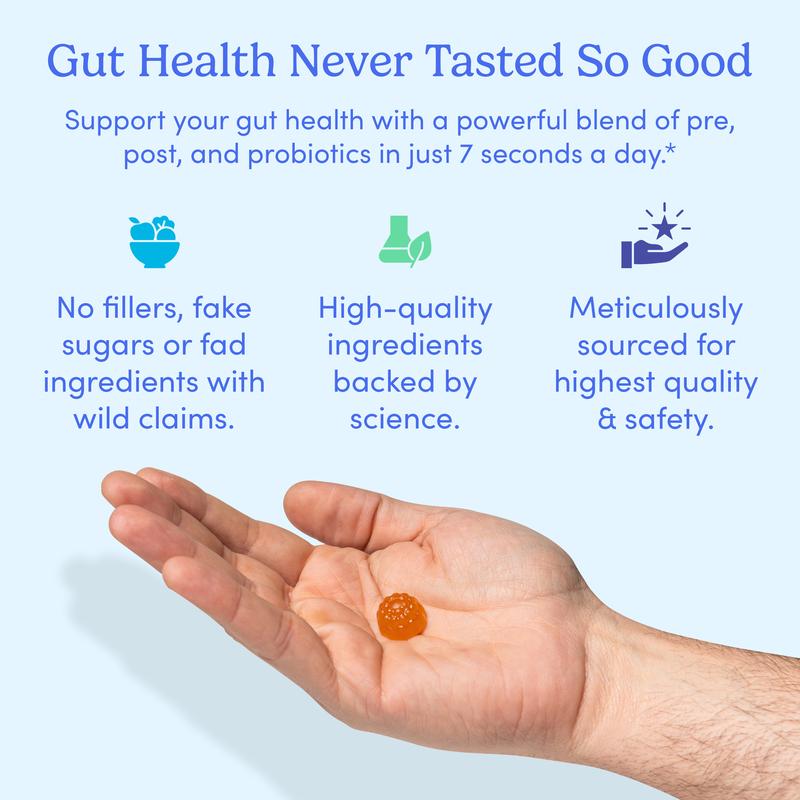 These Tribiotic Gummies include Pre+ Post+ and Probiotics to Support: