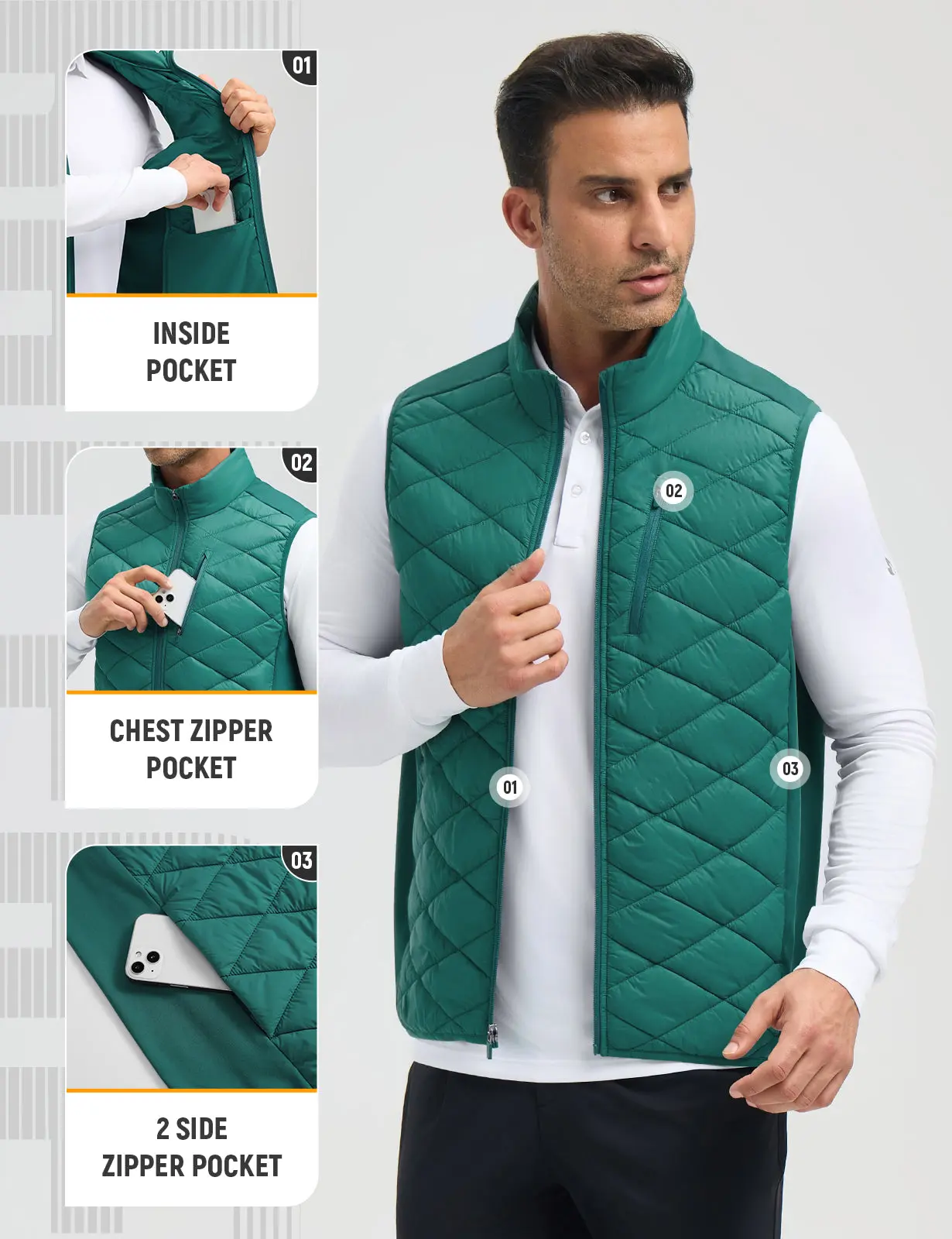 ·5 Utility Pockets: This lightweight jacket has 1 zippered front chest pocket, 2 zippered side pockets, and 2 interior pockets to securely hold your cell phone, golf glove, and other items for your storage needs.