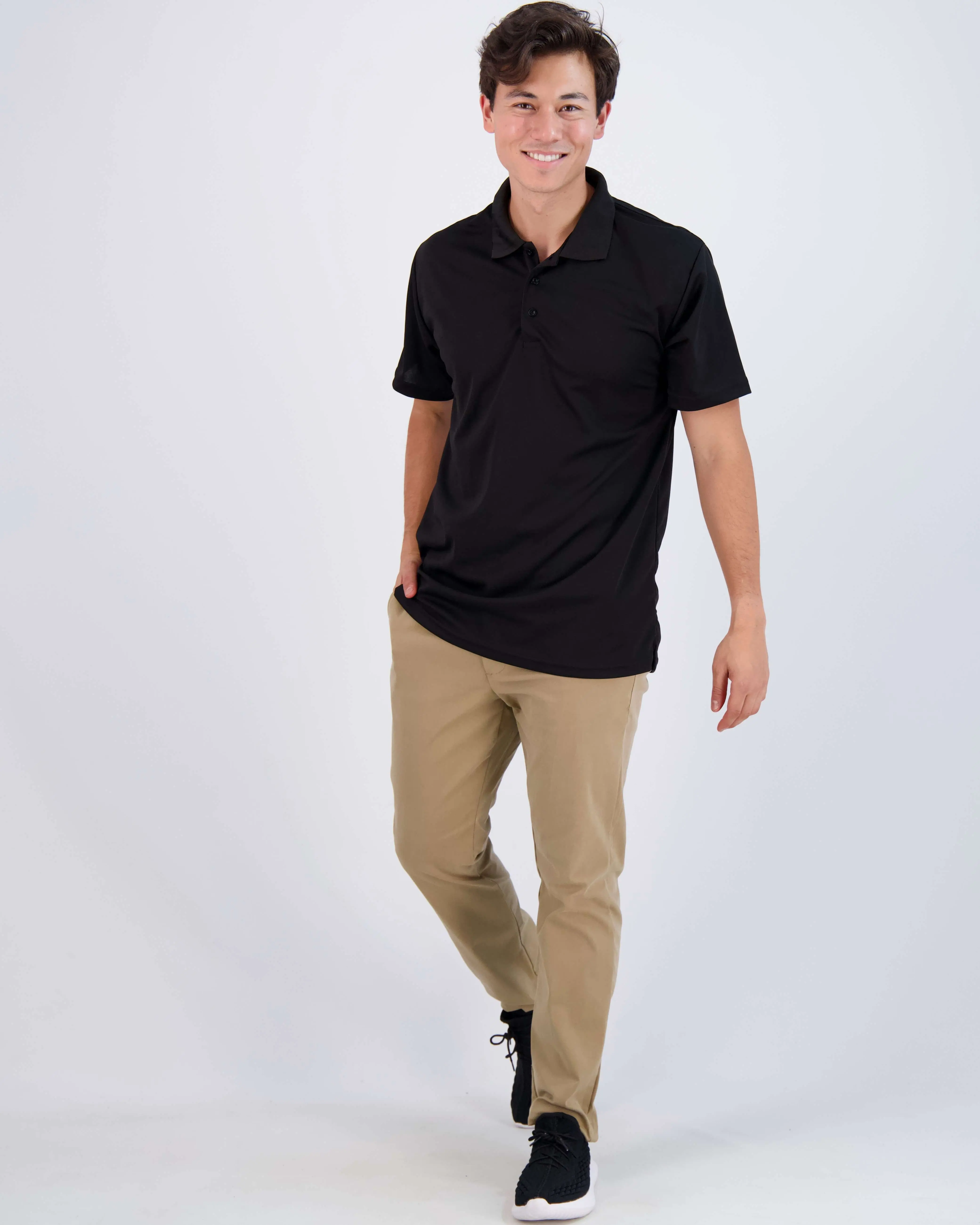 Fabric is wicking, non wrinkle. They are very comfortable.