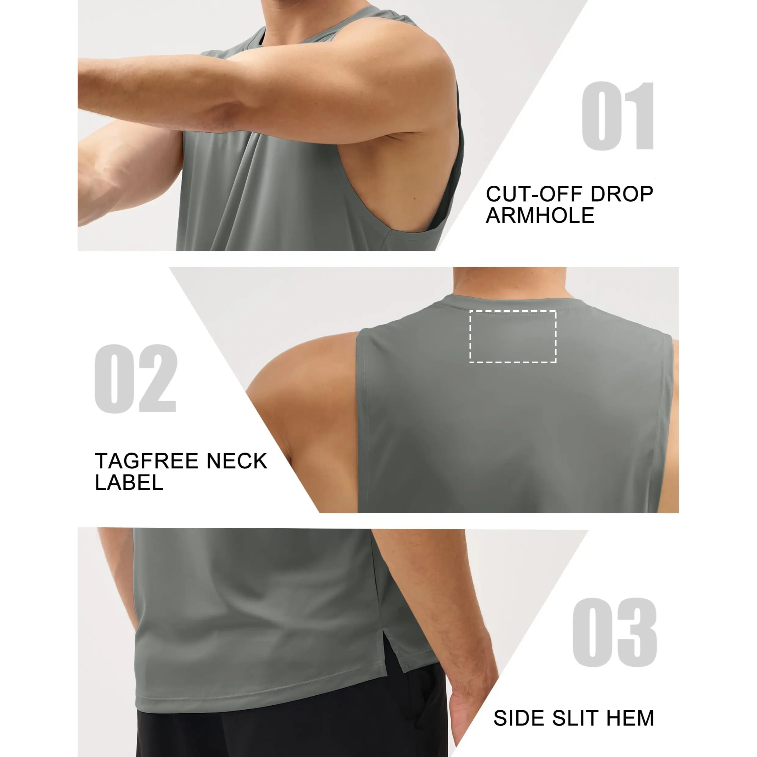 ·【Classic Design】 Cut-off drop armhole for more cooling;Tagfree neck label, no skin chafing;Side slit hem, more freedom of movement.