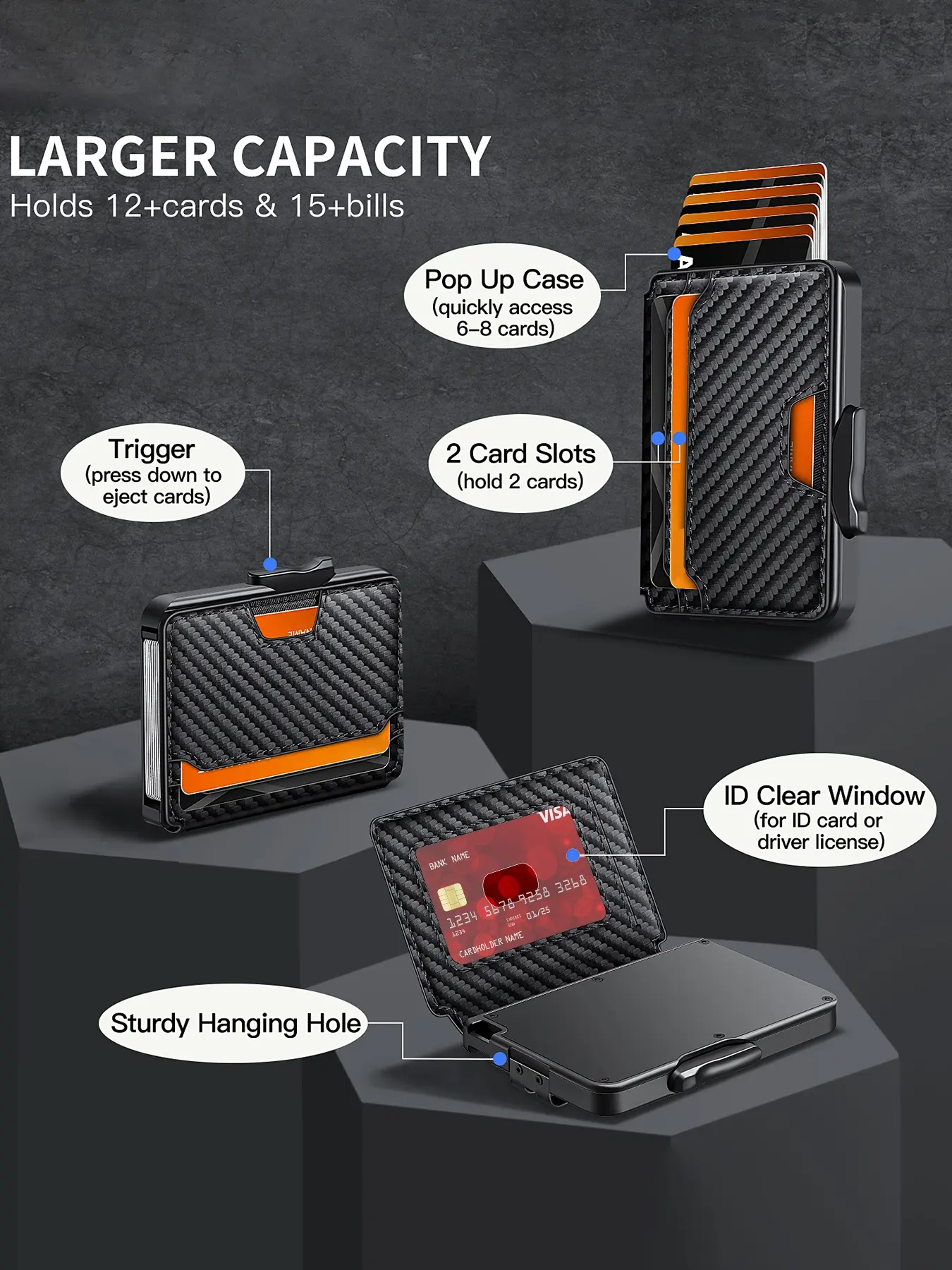 The wallet is pretty good it’s thicker than I expected kind of bulky in the front pocket but it does have a lot of room for cards I like the trigger to pop the cards up