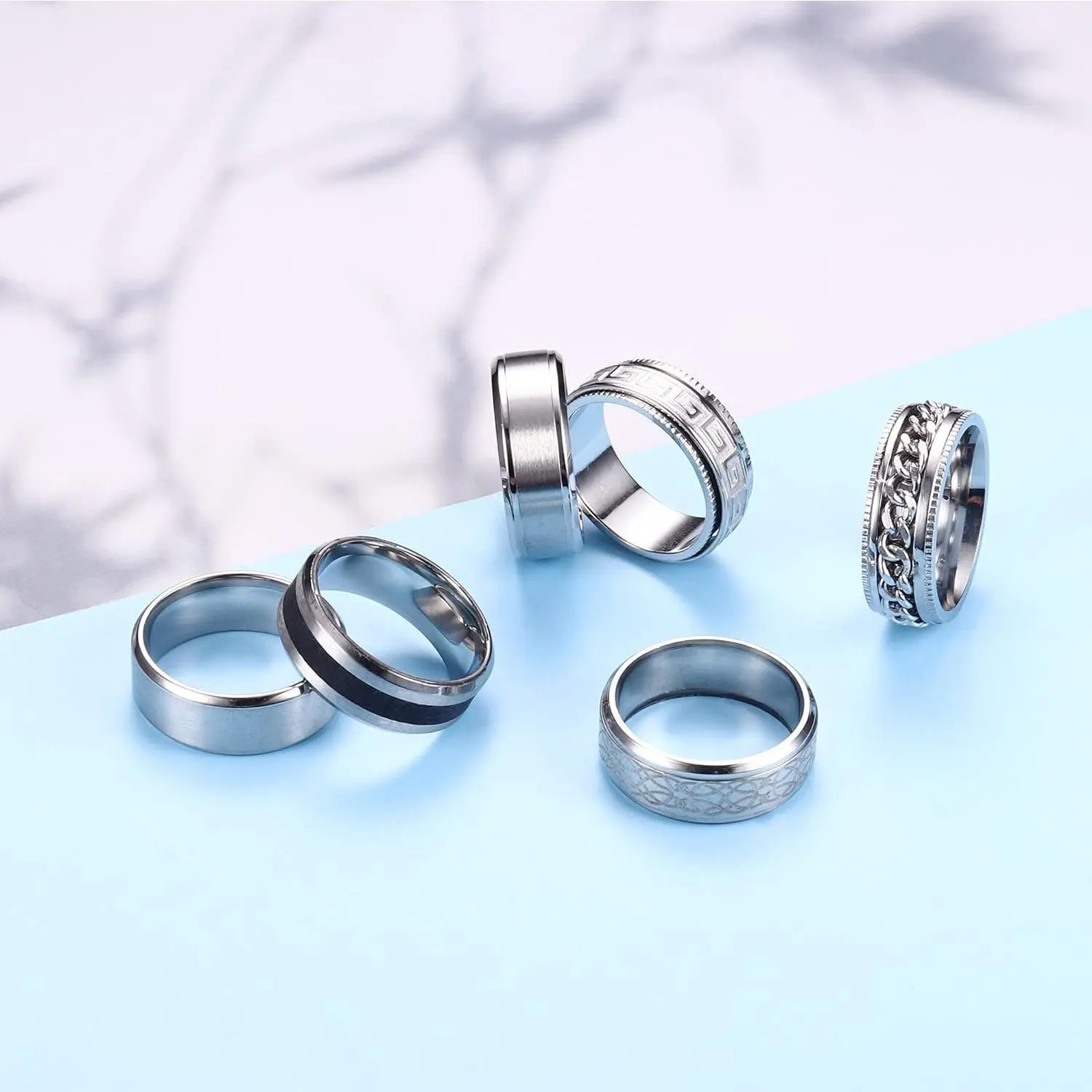 【MENS RING SET】-- You will get 6 count different stainless steel rings in 1 order, including 2 spinner rings, 3 simple rings and 1 celtic dragon ring. Minimalist design, luxury appearance.