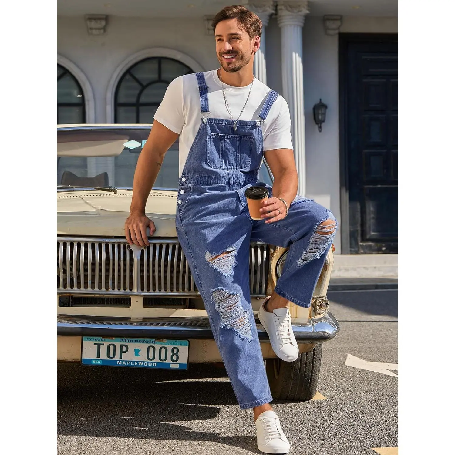 Beotyshow Men's Denim Bib Overall Ripped Distressed Jean Casual Fashion Workwear Adjustable Strap Hip Hop Jumpsuit