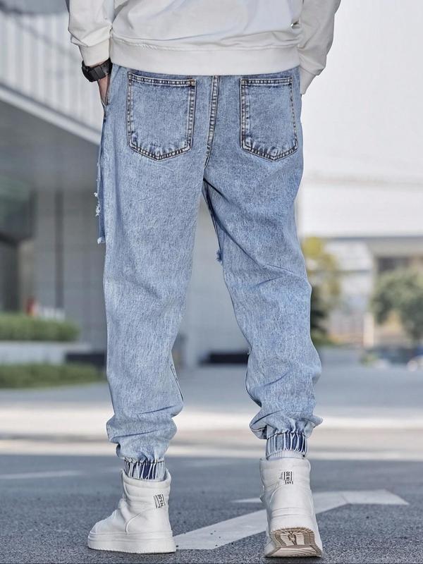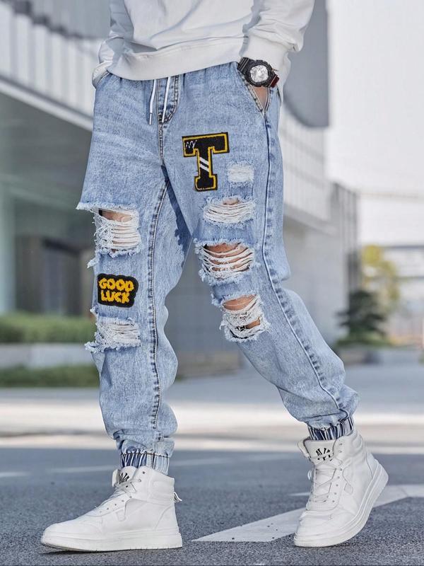Men's Patched Ripped Distressed Knee Jeans Drawstring Waist, Loose Casual Fashion Street for Daily Wear, Men's Trousers for All Seasons