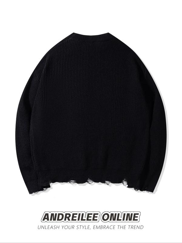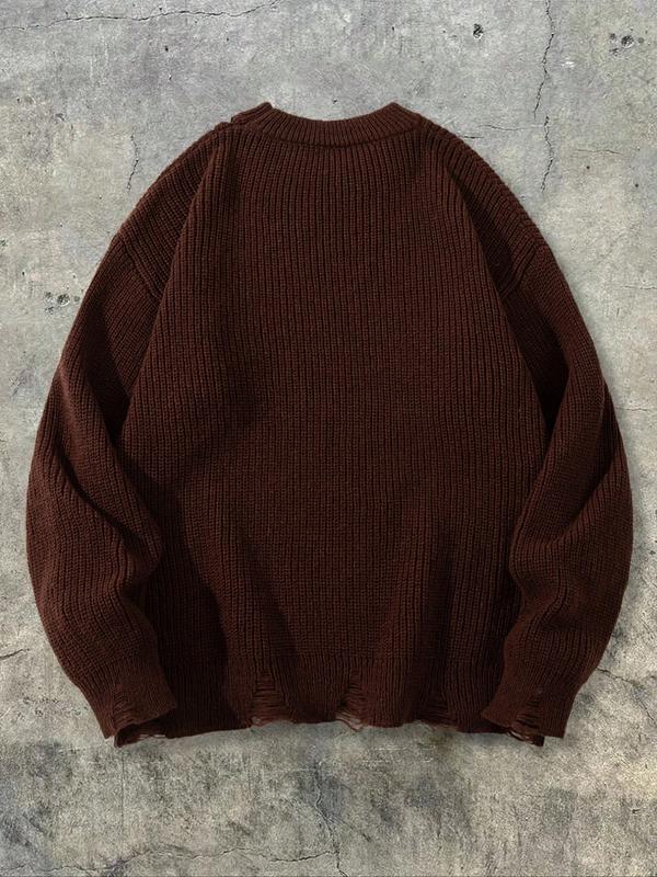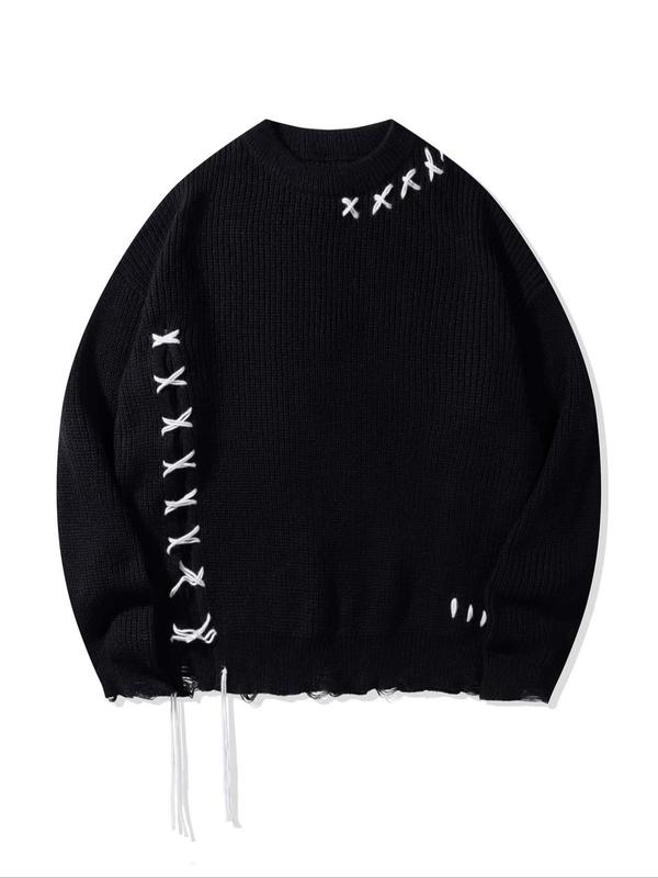 5. Men's Ripped Lace Up Drop Shoulder Sweater, Loose Street Fashion Long Sleeve Round Neck Jumper for Spring & Fall, Fashion Men's Knitwear for Daily Wear