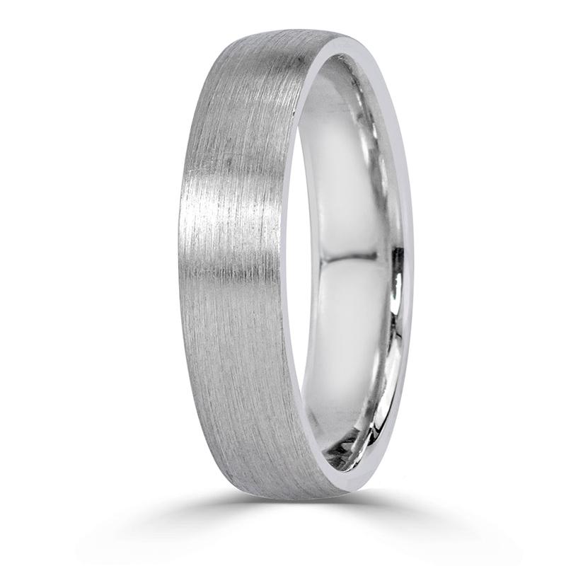 This modern take on the classic men's wedding band has a comfort fit and extraordinary quality. The platinum band is 5mm wide and has a satin finish.