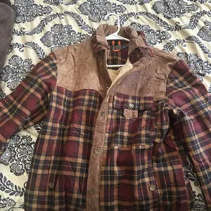 I was disappointed. The jacket sizing ran small. The description reads “flannel” however the jacket is glossy. The brown color is red. I gave it as a gift after it arrived 4 days later than expected. I wish I had time to take a photo.