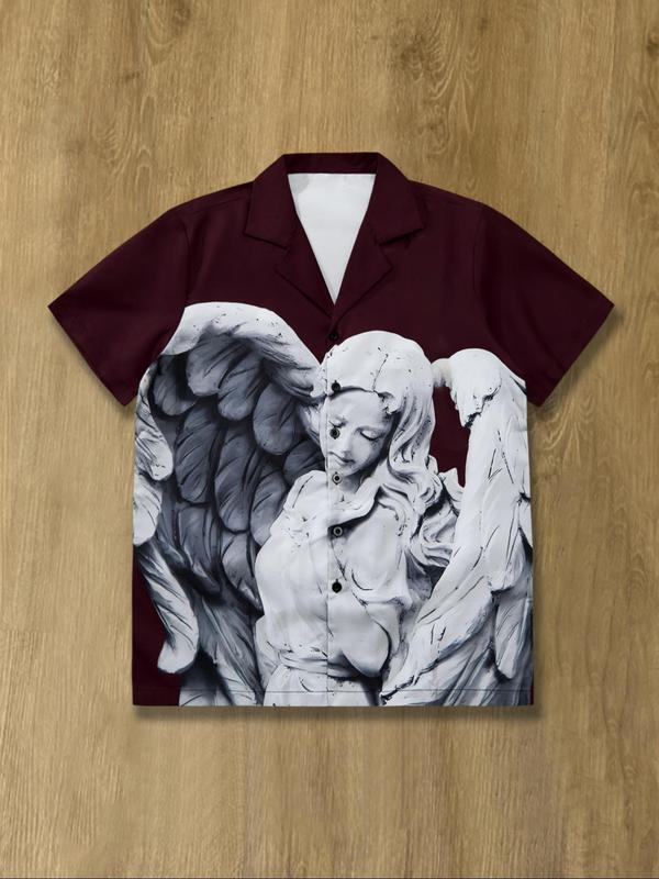 Men's Angel Print Short Sleeve Shirt, Regular Fit Casual Baroque Printed Collared Button Shirt for Summer, Fashion Men's Top for Daily Wear, Tropical