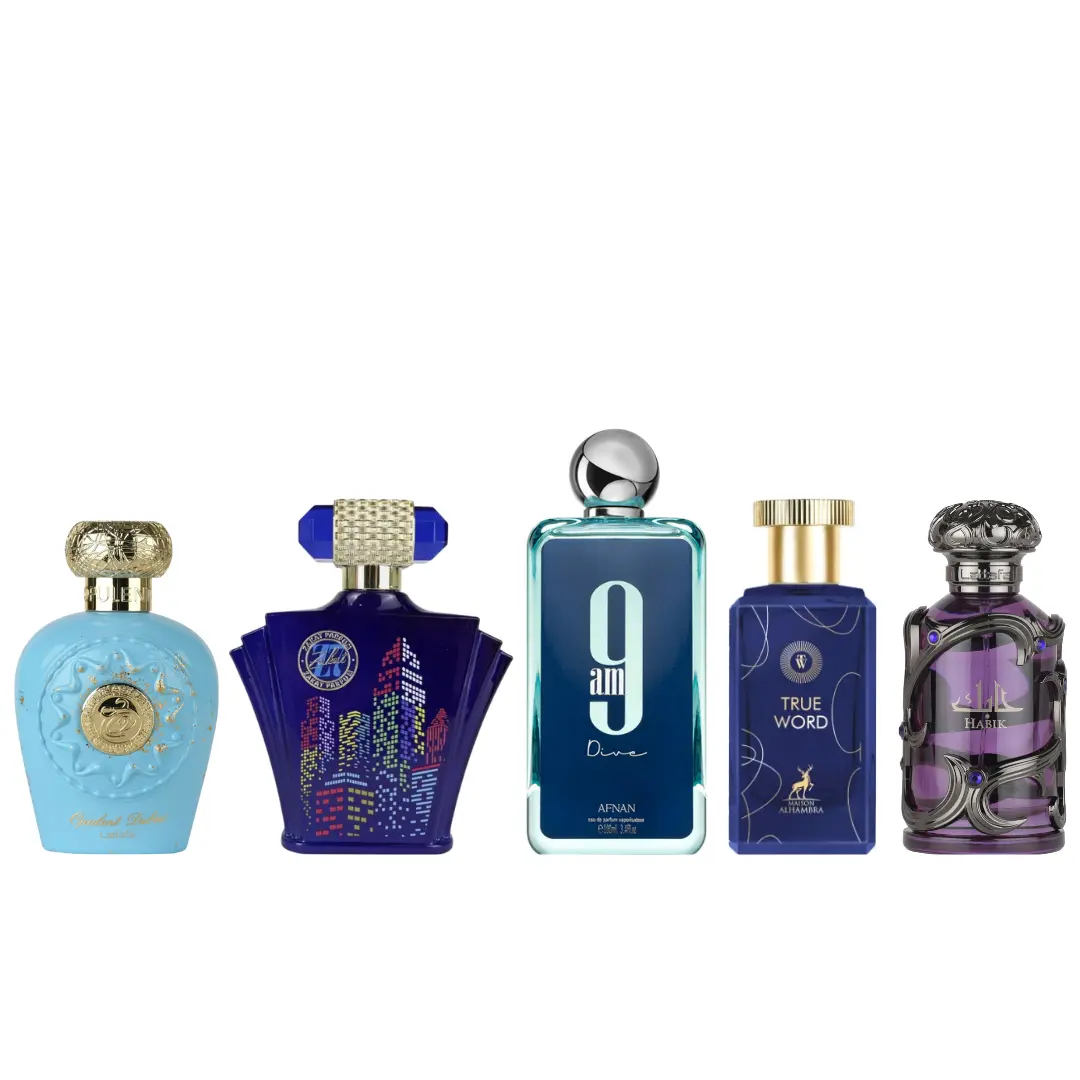 A powerful 5‑piece fragrance bundle featuring five bestselling men’s perfumes: the fresh‑clean confidence of True Word, the luxurious citrus‑amber vibe of Opulent Dubai, the aquatic blue freshness of 9am Dive, the spicy‑woody punch of Zakat Z7, and the smooth masculine warmth of Habik Men. This set covers every occasion — work, gym, casual days, nights out, and special events — making it one of the most versatile men’s bundles you can offer.