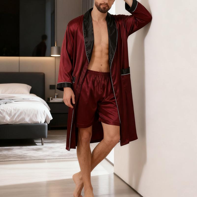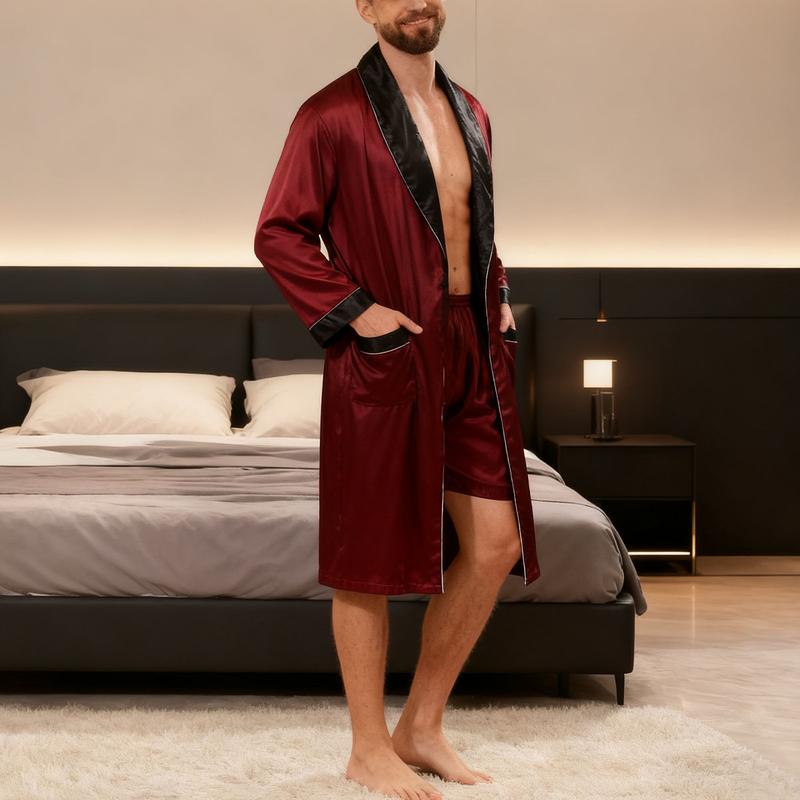 The outfit pictured is a men's silky loungewear set, predominantly deep burgundy with black lapels and cuffs, presenting a mature, understated, and sophisticated style.