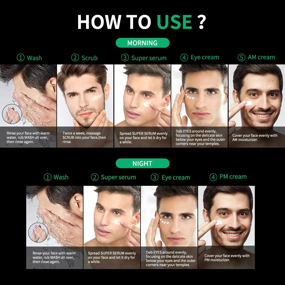 【Comprehensive Kit】: This six-piece men's skincare set includes facial cleanser, scrub, eye cream, sunscreen, and more.