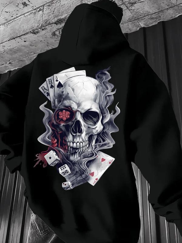 Men's Skull & Playing Card Print Hoodie, Fashion Casual Regular Fit Hooded Sweatshirt for Daily Holiday Outdoor Wear, Men Clothes for Fall & Winter, Halloween