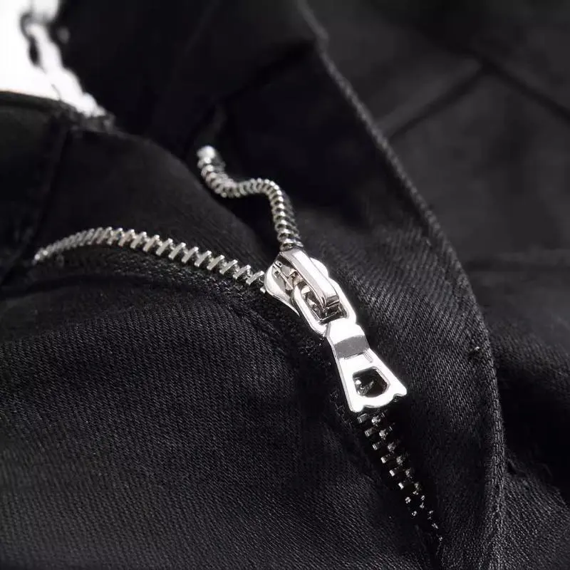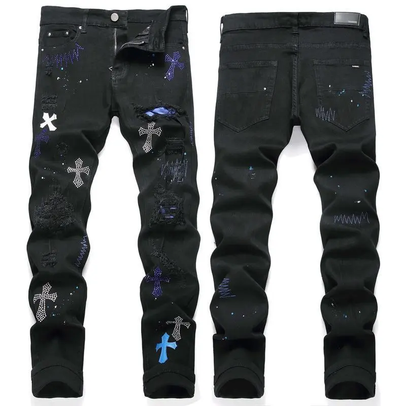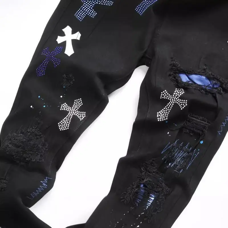 5. European and American high street black cross badge rhinestone jeans men's slim fit casual pants