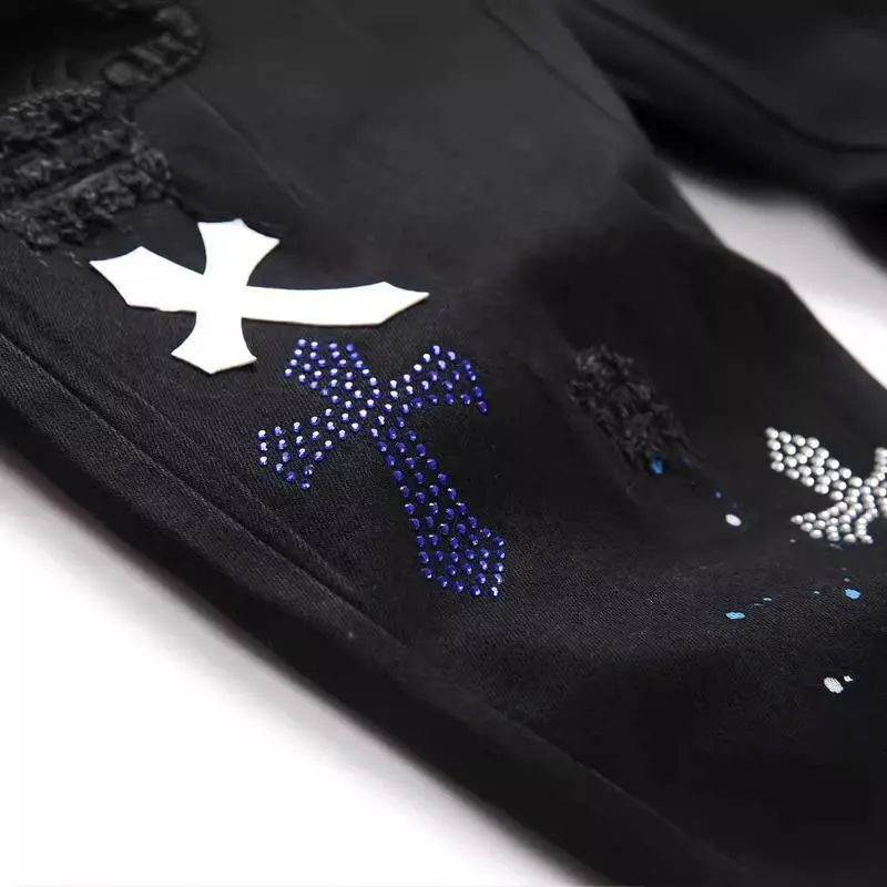 European and American high street black cross badge rhinestone jeans men's slim fit casual pants