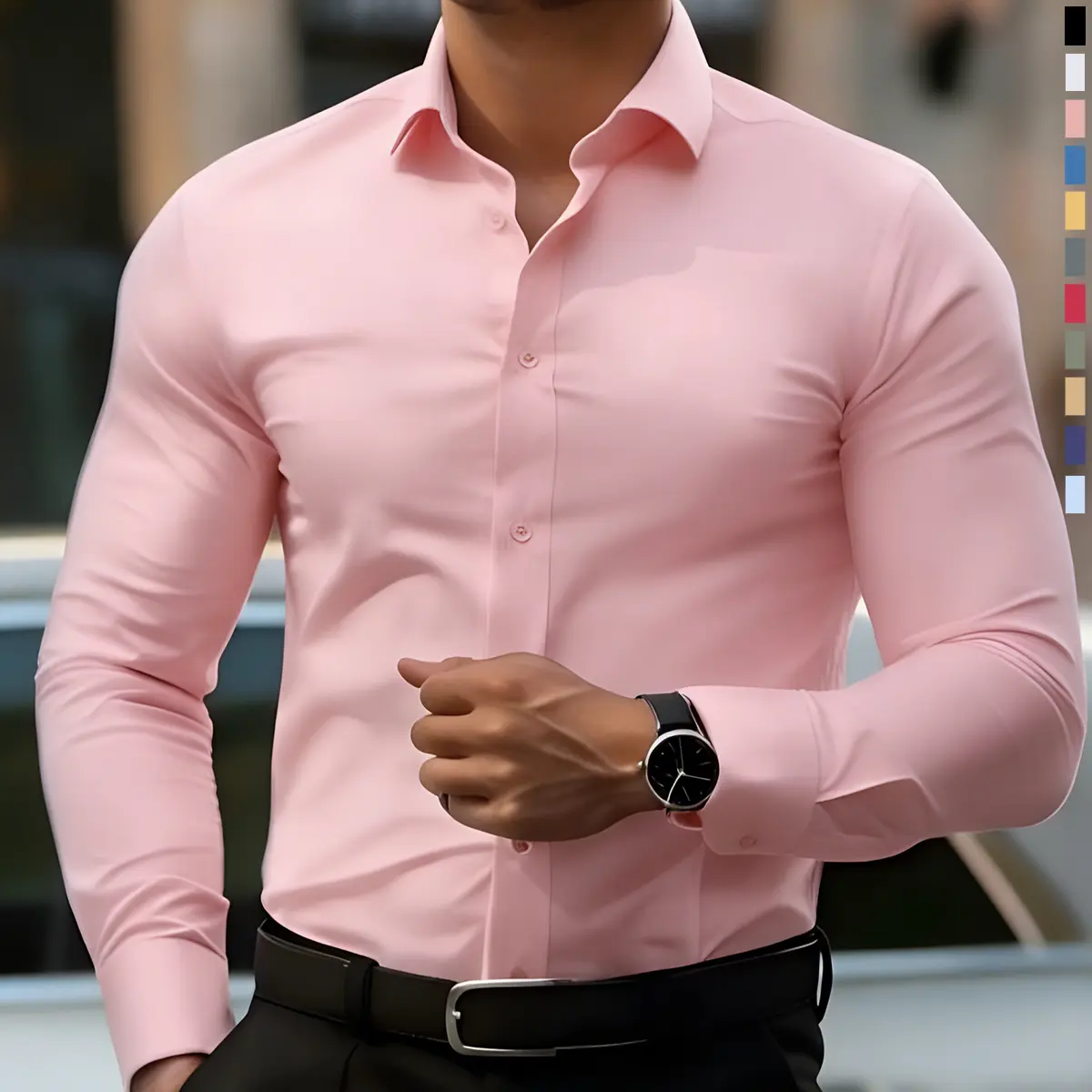 This Non,stretch men's slim fit long sleeve shirt fit my husband 6'4 tall frame just right. The material is very lightweight. The khaki color is more gold than light brown.