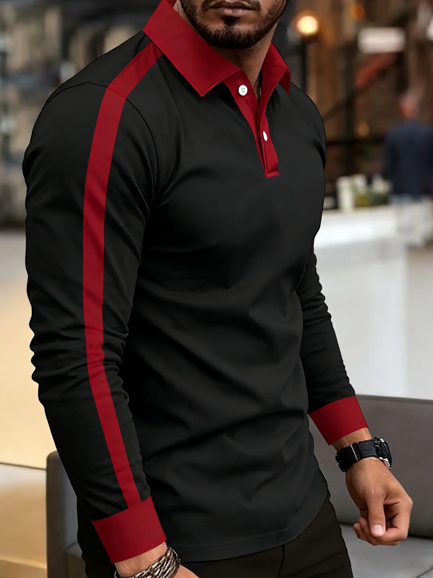 5. 2026 Men's slim-fit long-sleeve polo shirt, made from soft and comfortable fabric, featuring a red and black contrast double-button collar, color-blocked cuffs, and side stripe accents, perfect for everyday wear and casual styling.