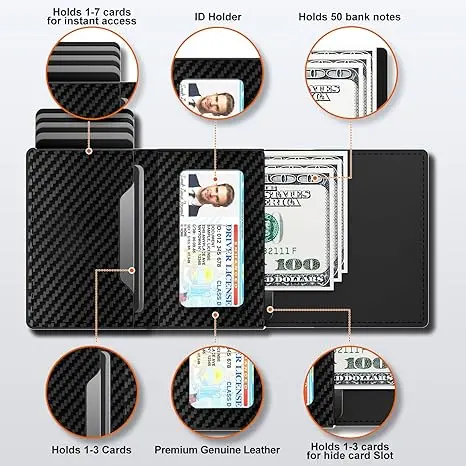 ✨ Material & Design: This wallet card holder is made of leather and features carbon fiber. It is designed to be slim and minimalist, perfect for those who prefer a sleek look. The wallet has a 6-9 card capacity, making it ideal for carrying essential cards.