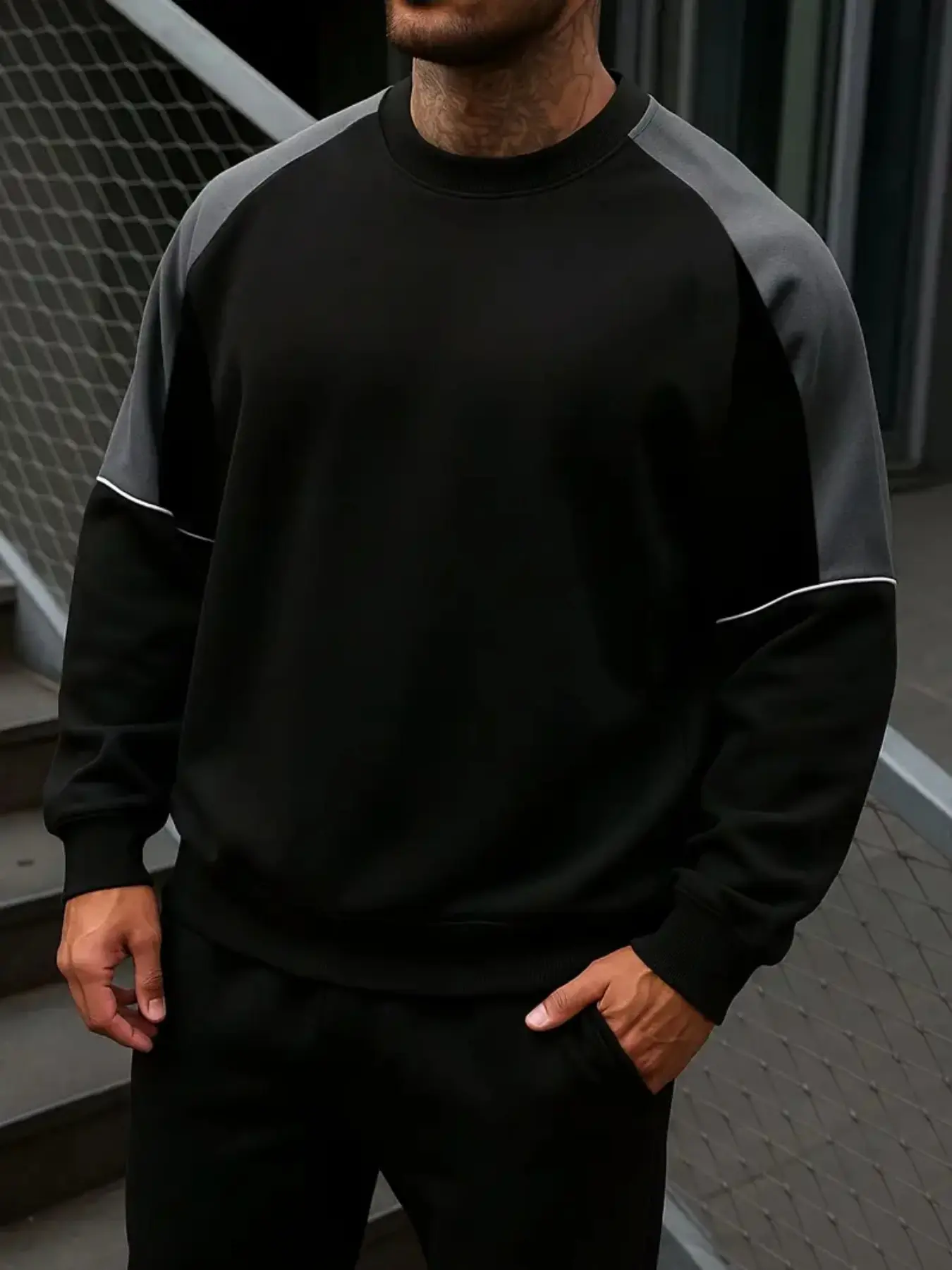 Men's Solid Color Patchwork Crew Neck Long Sleeve Knit Fitted Casual Top, Comfortable Fashion Design, Perfect for Spring & Fall Seasons