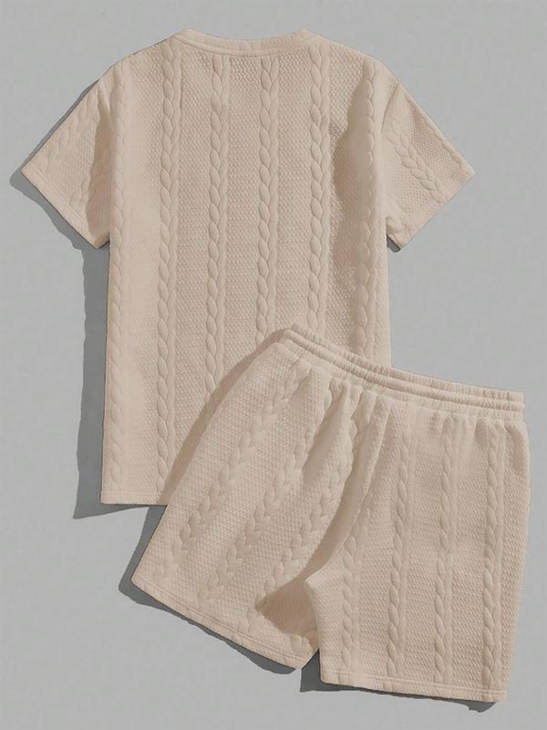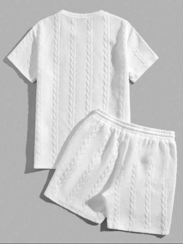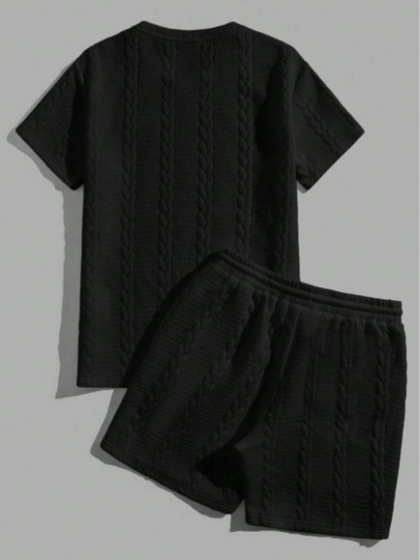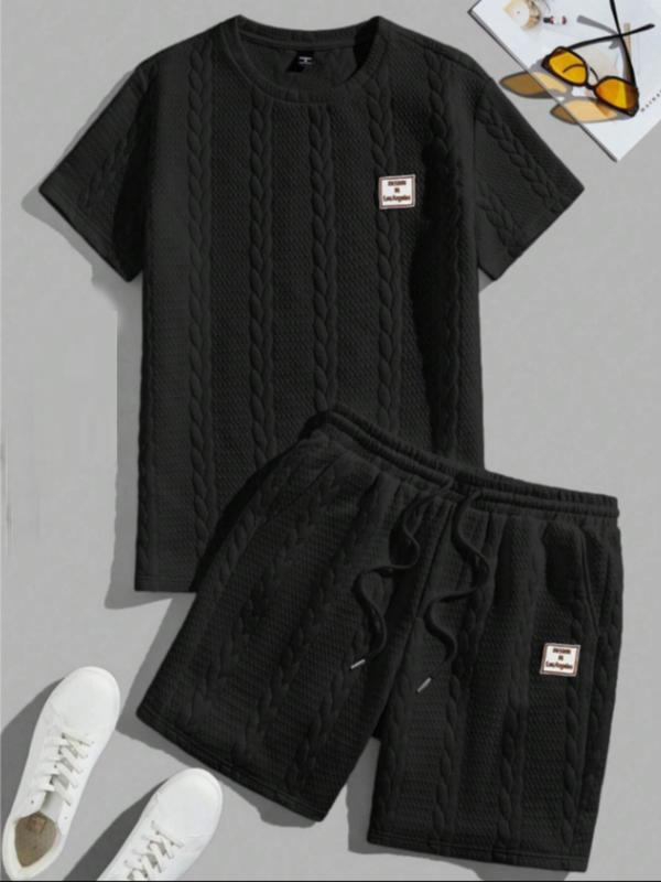 5. Men's Solid Textured Patched Tee & Drawstring Waist Shorts Set, Regular Fit Casual Round Neck Short Sleeve T-shirt & Pocket Shorts, Men's Summer Clothes