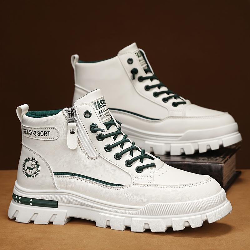 Men's Versatile Sport Ankle Boots - Casual Sport, White with Green Accents, Durable PU Upper and EVA Insole, Zipper and Lace-Up Closure, Suitable for Casual Wear - All Seasons, Athletic Shoes #MensSportBoots #CasualAthleticStyle #StreetwearSneakers #EverydayComfortShoes #TrendyMensFootwear