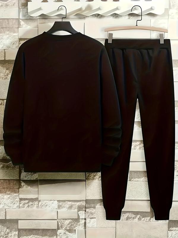 Men's Sports Set - Round neck Long sleeved Top with Strap up Running Pants, Polyester Knitted Fabric, Regular Style Sportswear, Printed Details, Autumn 2-piece Set.