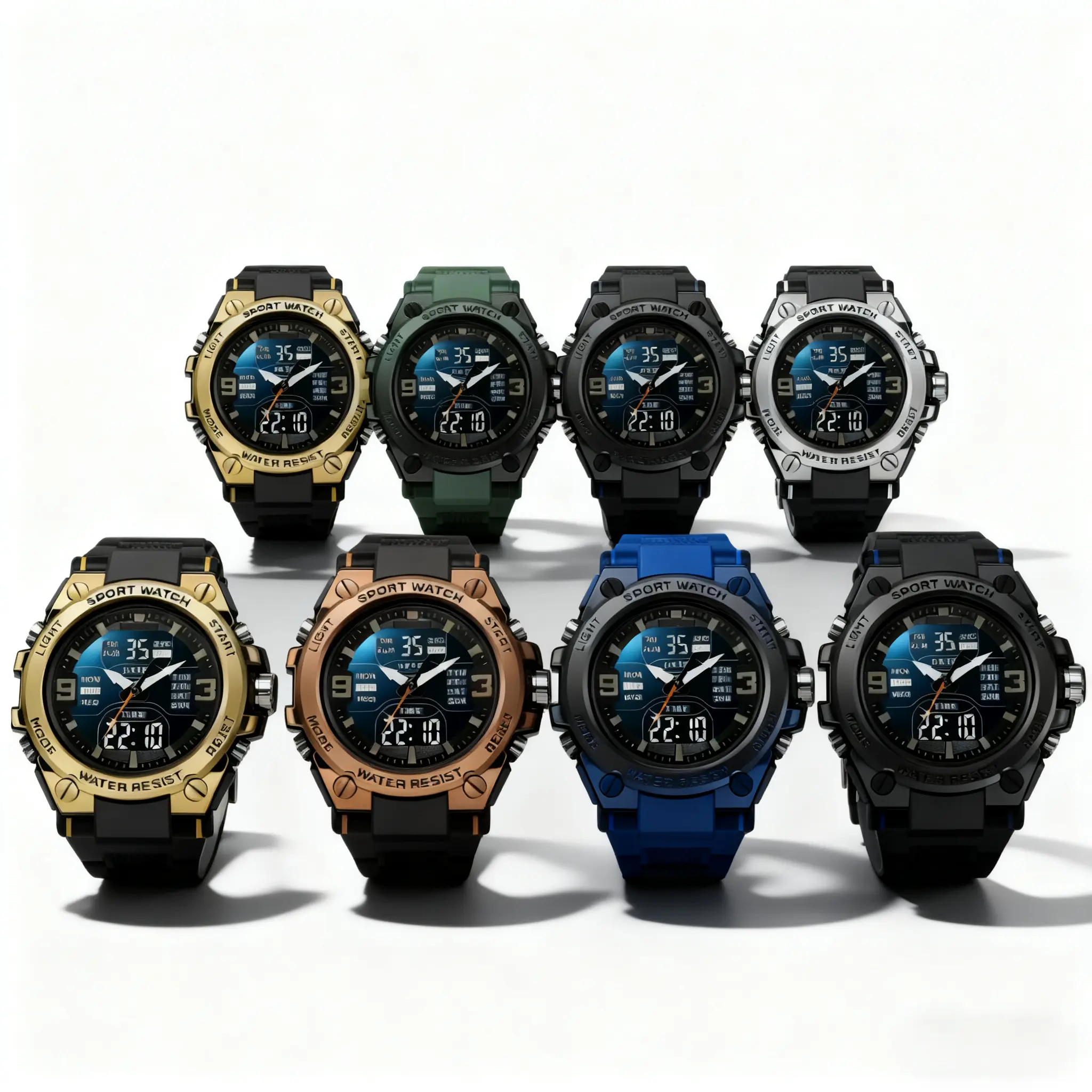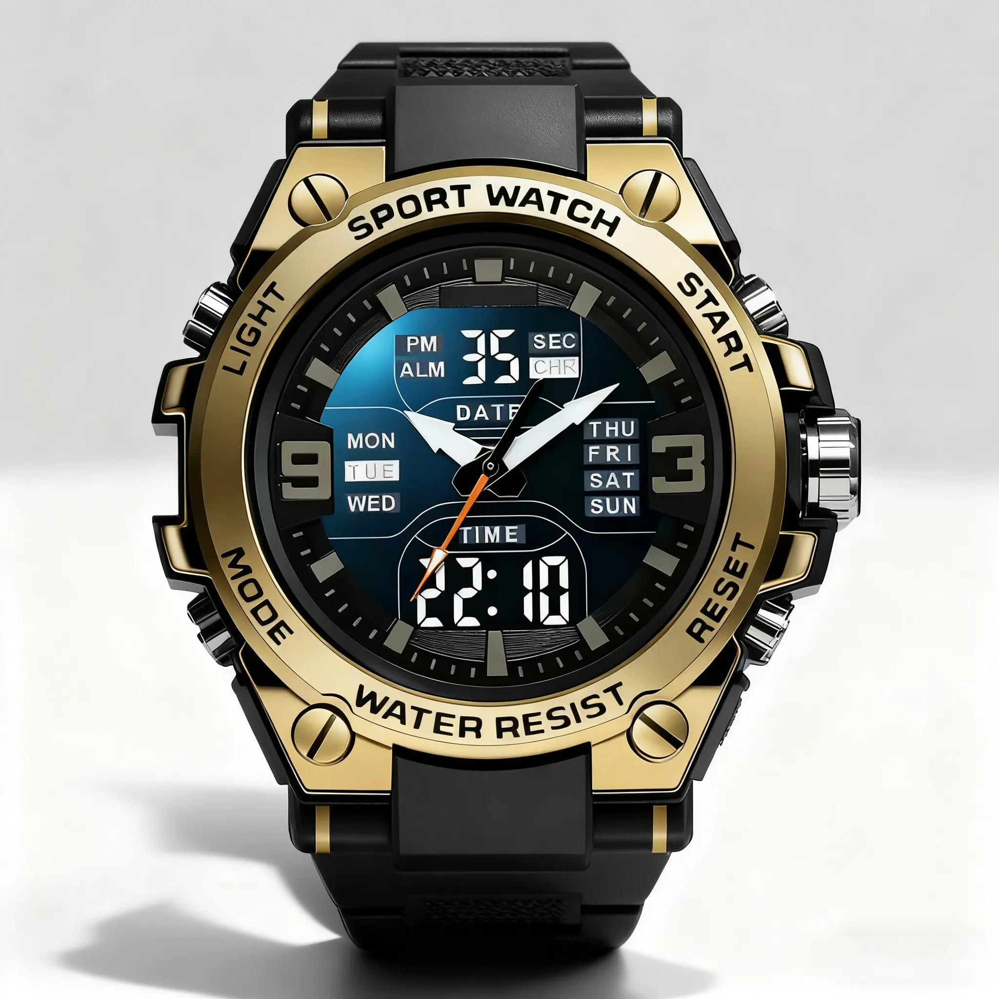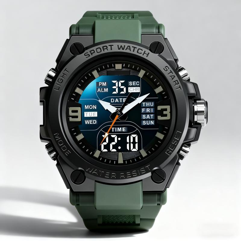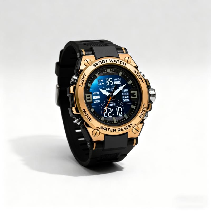 Elevate your style with this trendy electronic wristwatch! Perfect for daily wear, this watch comes in a gift box. It features an analog + digital display, catering to men. With a waterproof rating of 30M, it's ideal for everyday use. The electronic movement ensures reliable timekeeping. Choose from black, silver, blue, gold, rose gold, or green.