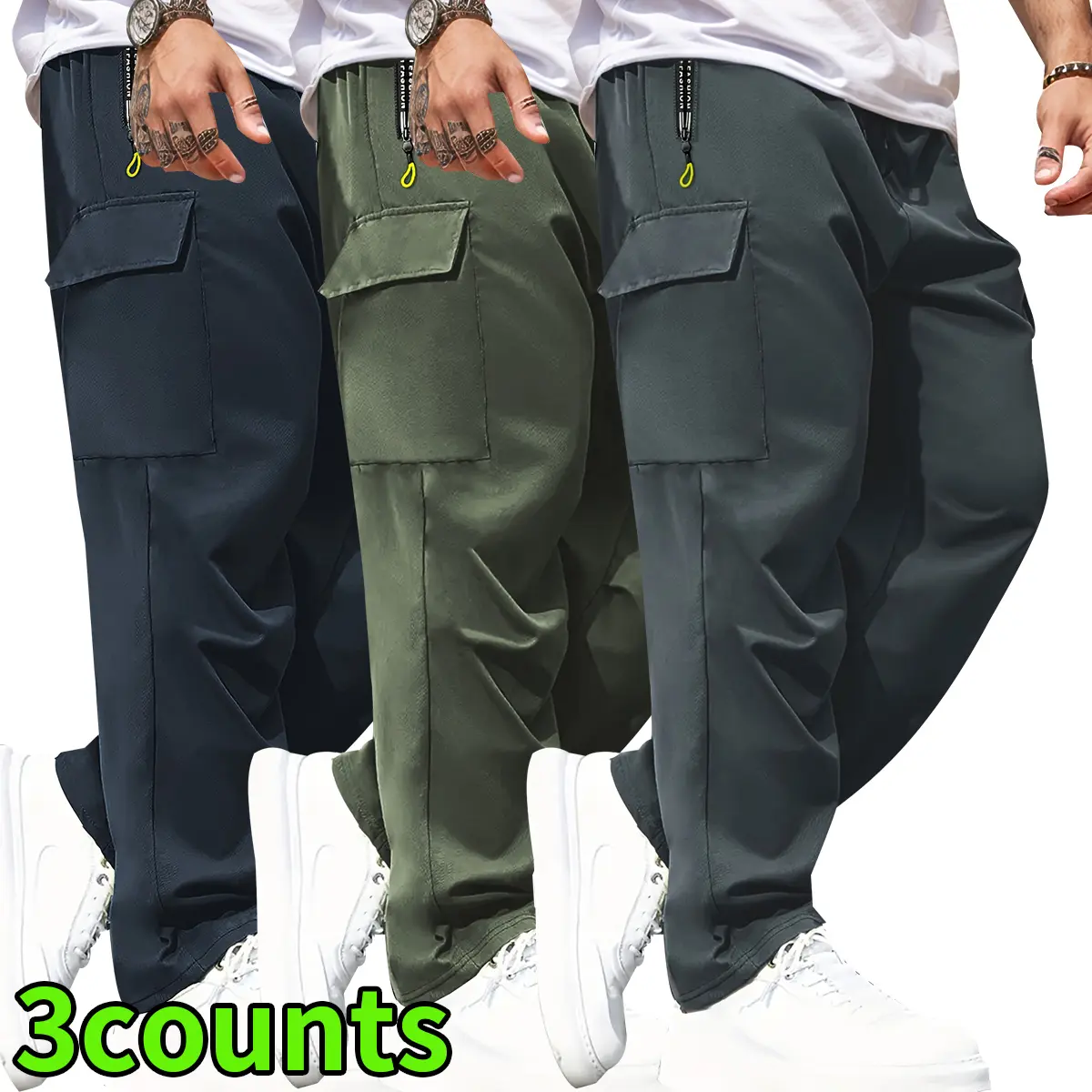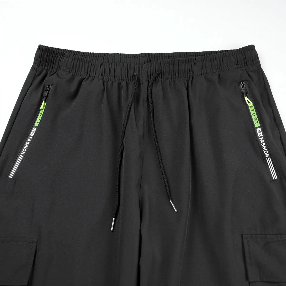 Men's spring-autumn style letter green zipper pocket work pants with fashionable large patch pocket design with drawstring elastic waist, suitable for jogging, hiking and daily wear. Valentine's Day gift.