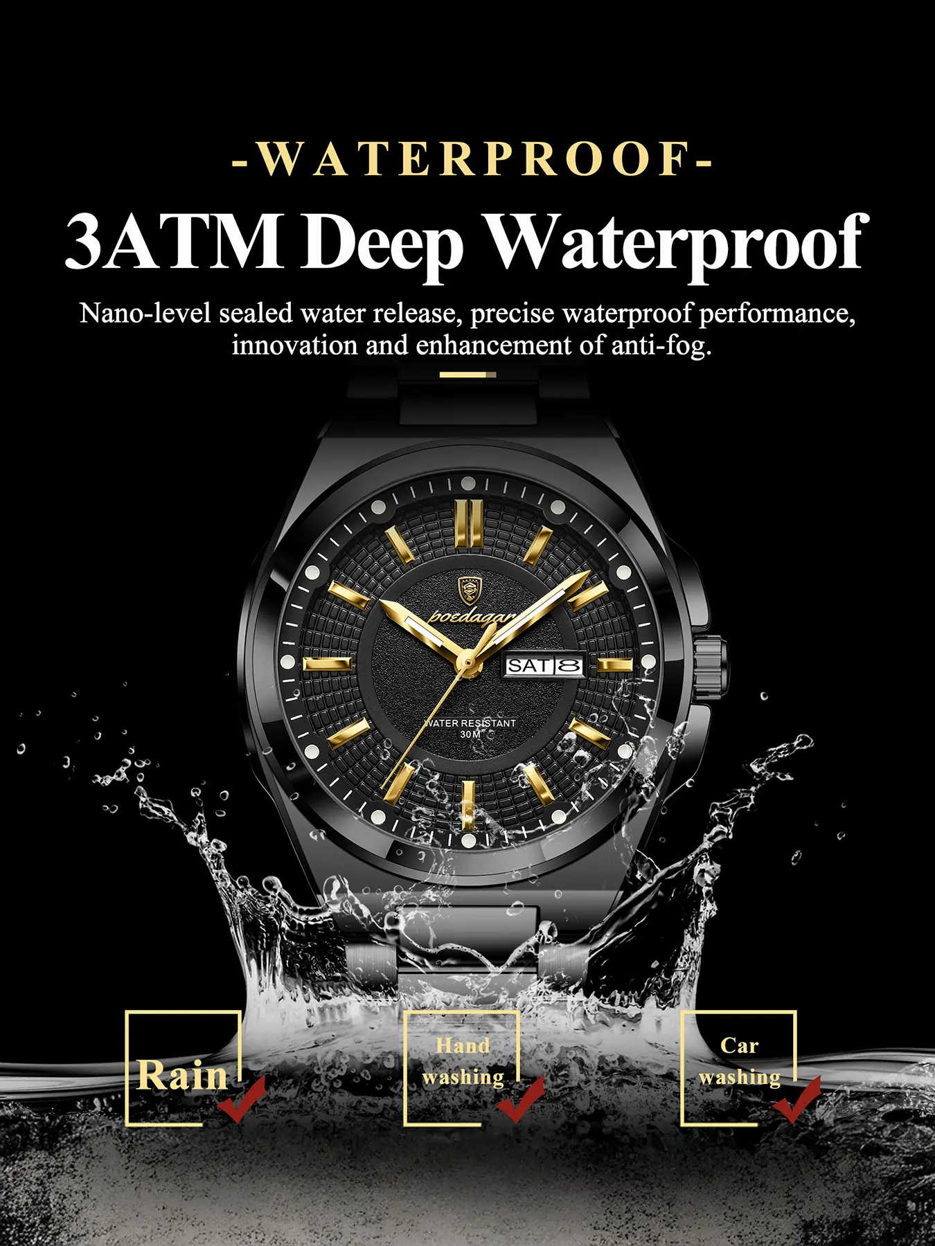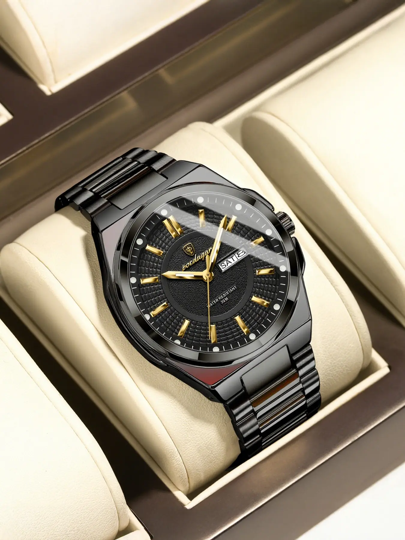 ビジネス向けの高級メンズ腕時計、ステンレス製・防水・夜光機能付き、日付表示・曜日表示、カジュアルファッションのクォーツ手巻き時計