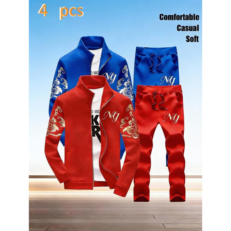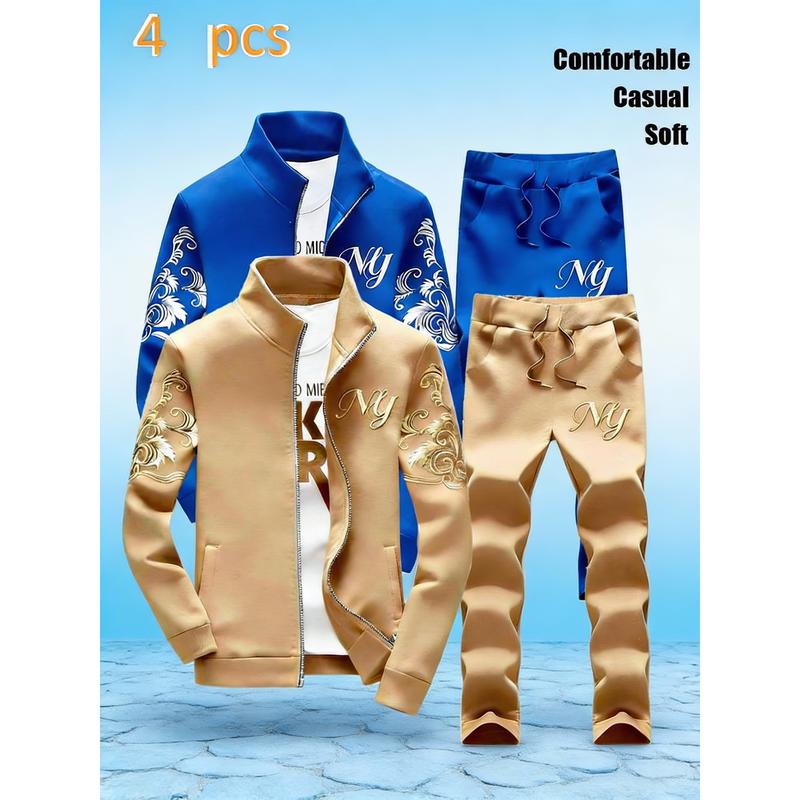 Men's Stand-Collar Zipper Tracksuit - Stylish NY Embroidered Pattern, 4-Piece Casual Sports Set