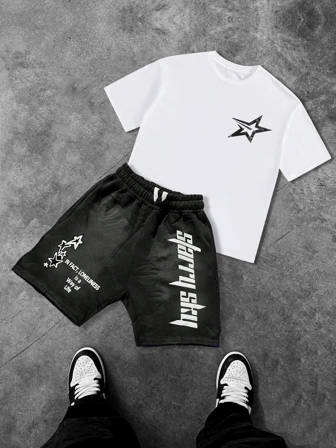 Men's Two-Piece Set Star Print Short Sleeve Tee & Drawstring Waist Shorts, Regular Fit Casual Round Neck T-Shirt & Track Shorts #womenssweatshirtset #photoshootclothing #womens2piecesets #sportspants #cozyloungewearset #athleisuremen #lulutracksuit #2piecesetoutfit #fashionshorts #sportybodysuit