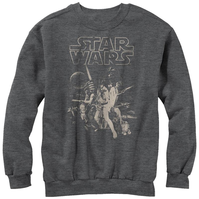 Luke Skywalker, Princess Leia, Han Solo, Darth Vader, and all the rest of your favorite Star Wars characters are featured on the Star Wars Classic Poster Heather Charcoal Sweatshirt. This cool Star Wars sweatshirt has one of the original Star Wars poster designs printed in front for a fun throwback style.