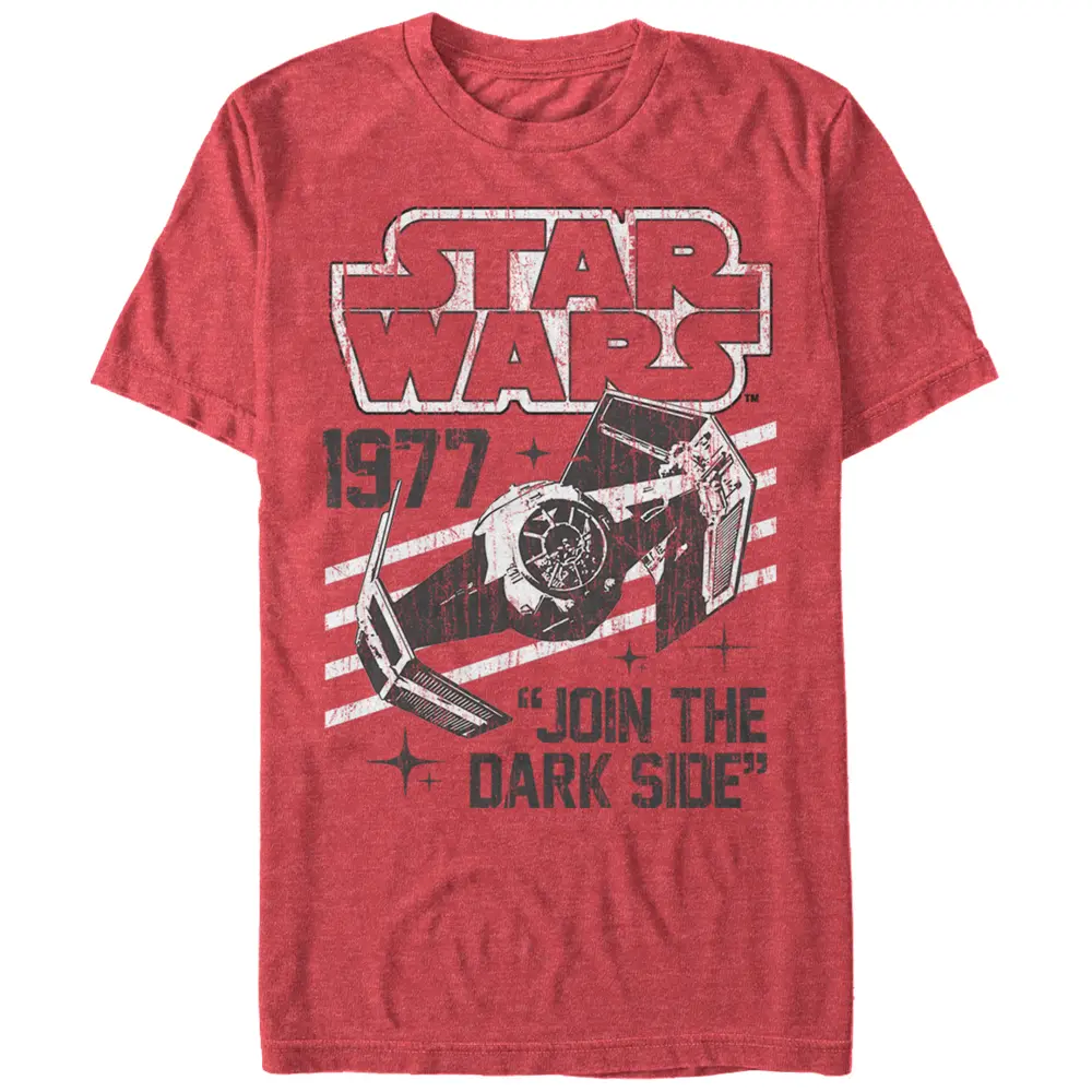 Take your Star Wars style in a classic direction with the Star Wars Darth Vader's TIE Fighter 1977 Heather Red T-Shirt. Darth Vader's TIE Fighter Advanced zooms across the distressed vintage-style print on this red shirt with the Star Wars logo, "1977," and "Join the Dark Side" printed in black and white around it.