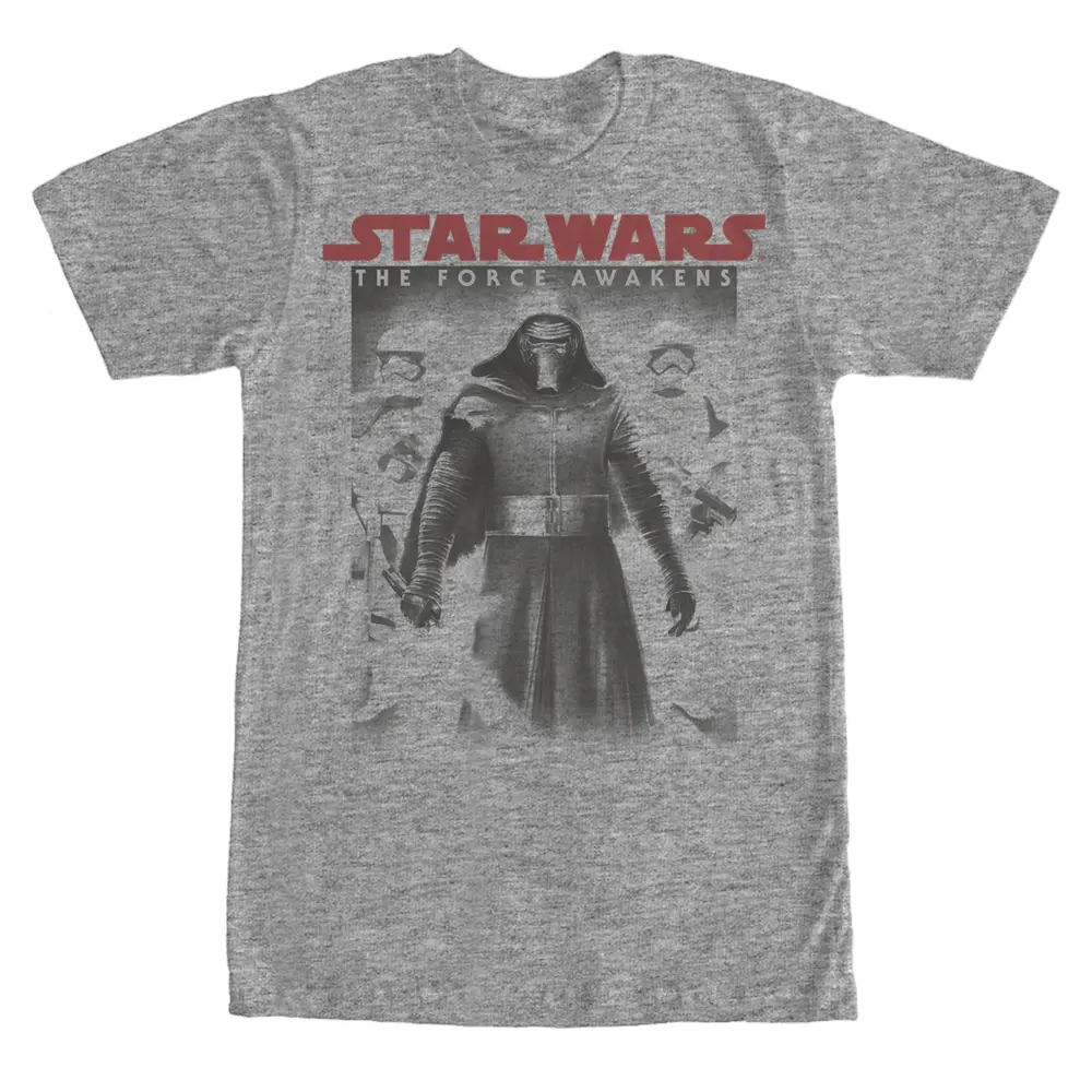 The Star Wars Kylo Ren Faded Heather Gray T-Shirt won't make you a Sith Lord, but it will show your appreciation for the dark side of the Force and the First Order. A faded print on the front of this awesome gray Star Wars Episode 7 t-shirt features Kylo Ren and Stormtroopers printed below the Force Awakens logo.