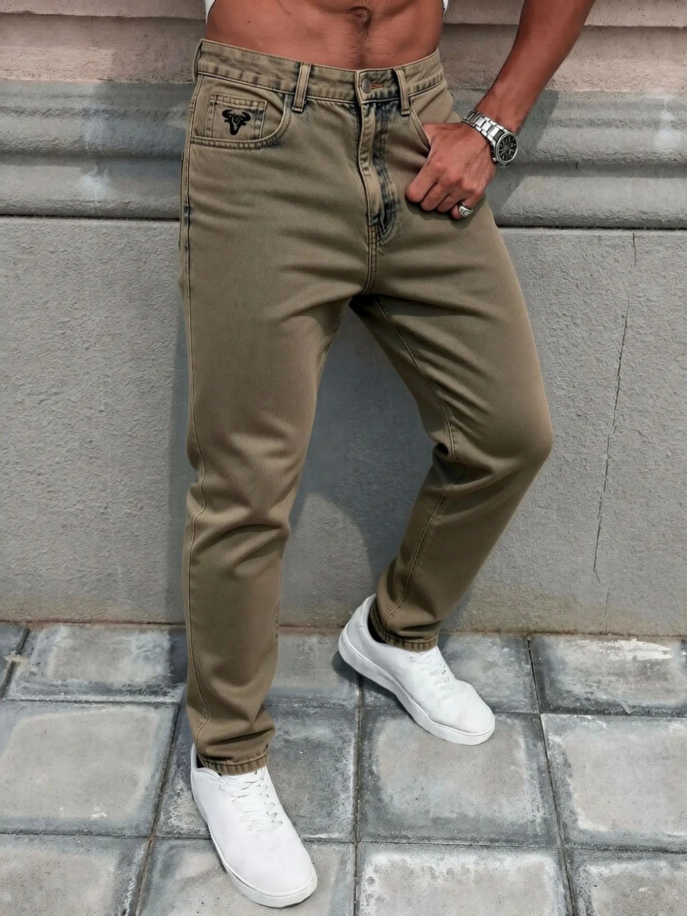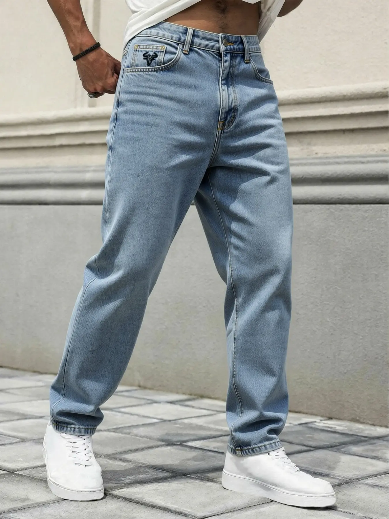 Men's straight-leg jeans, washed and distressed, with embroidered logo details. High-street casual denim pants with a comfortable regular fit. Suitable for daily casual wear, urban street style, and dating fashion looks. A must-have trendy men's pants 🔥