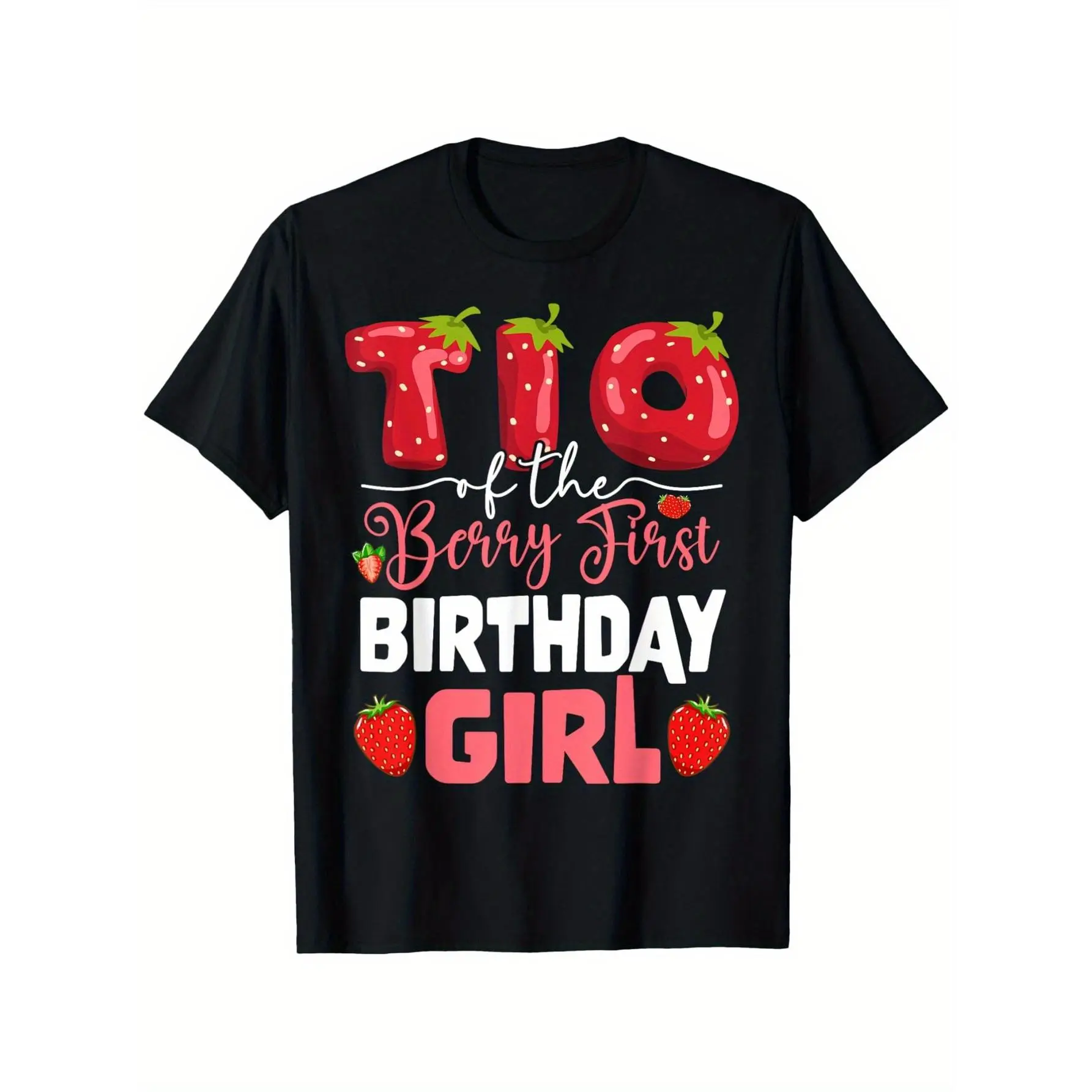 [Festive] Men's "Tio of the Berry First Birthday Girl" Strawberry Uncle T-Shirt - 100% Cotton, Round Neck, Black, Sizes S-XXXL, Casual Style, Machine Washable, Strawberry Themed Items y2k  outfits  men time  tee   double print  Vintage Metalcore Graphic