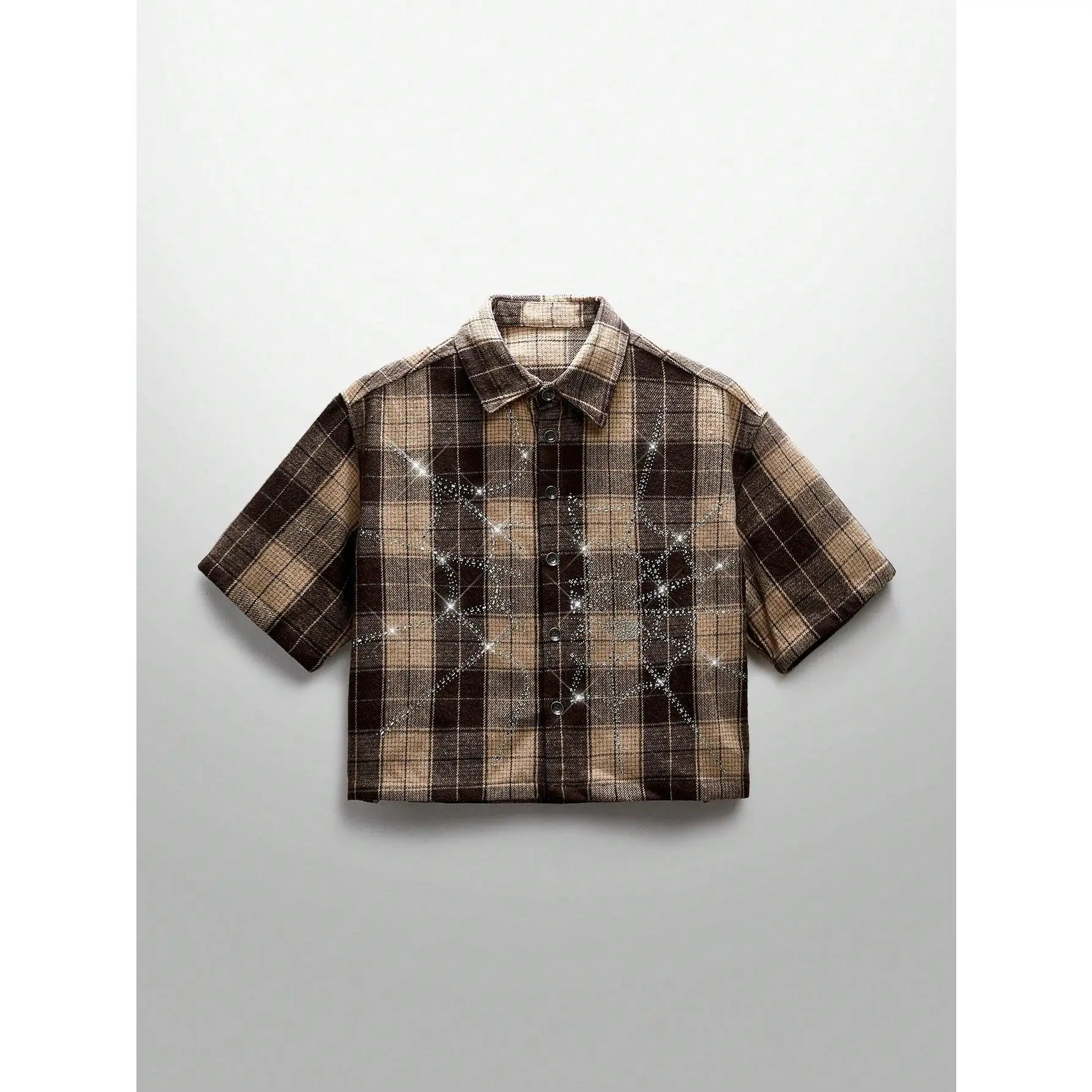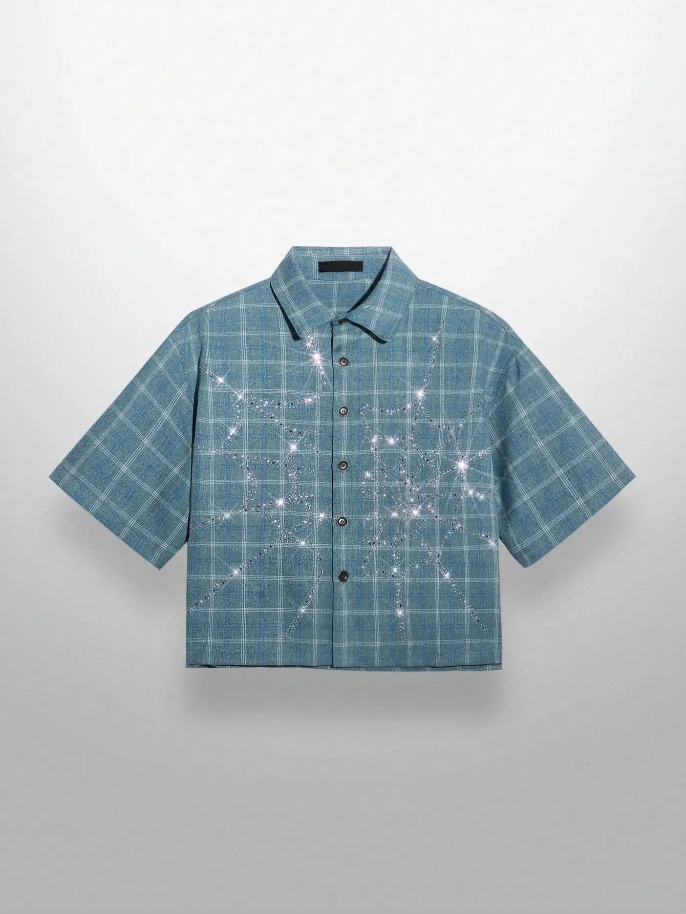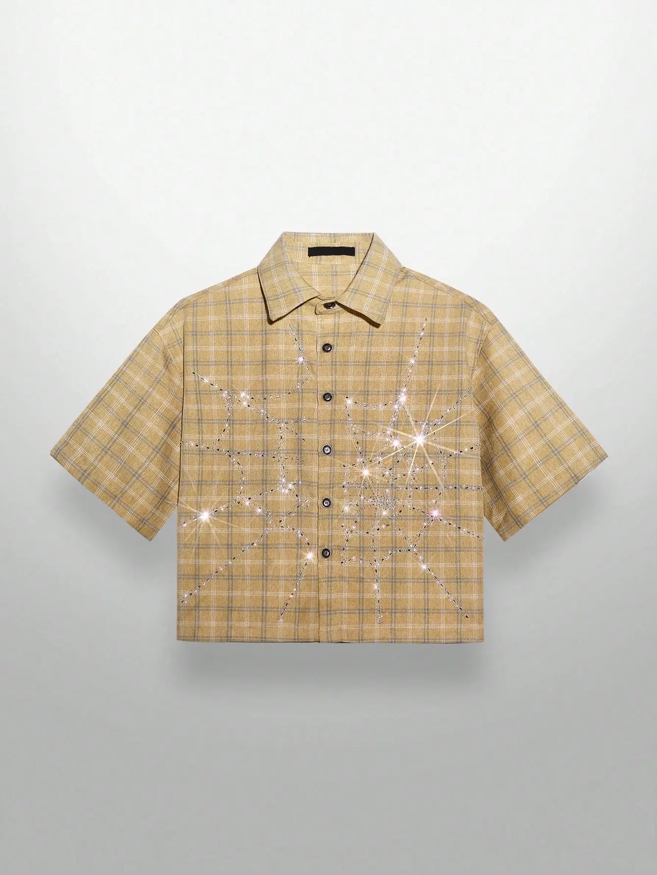 【Order Size Up】Unisex Spring Summer Glitter Street Style Crystal Spider Web Plaid Short Sleeve Woven Shirt