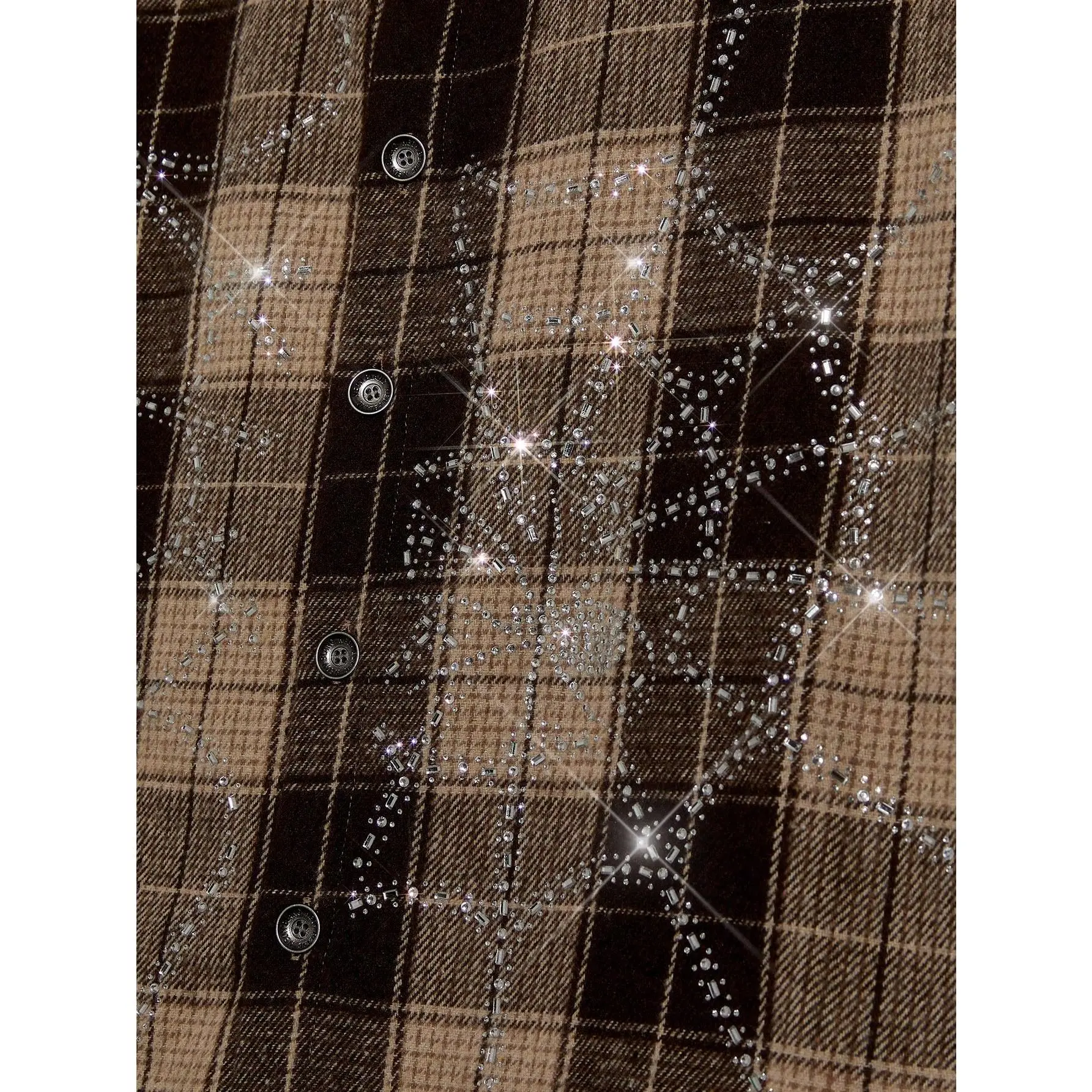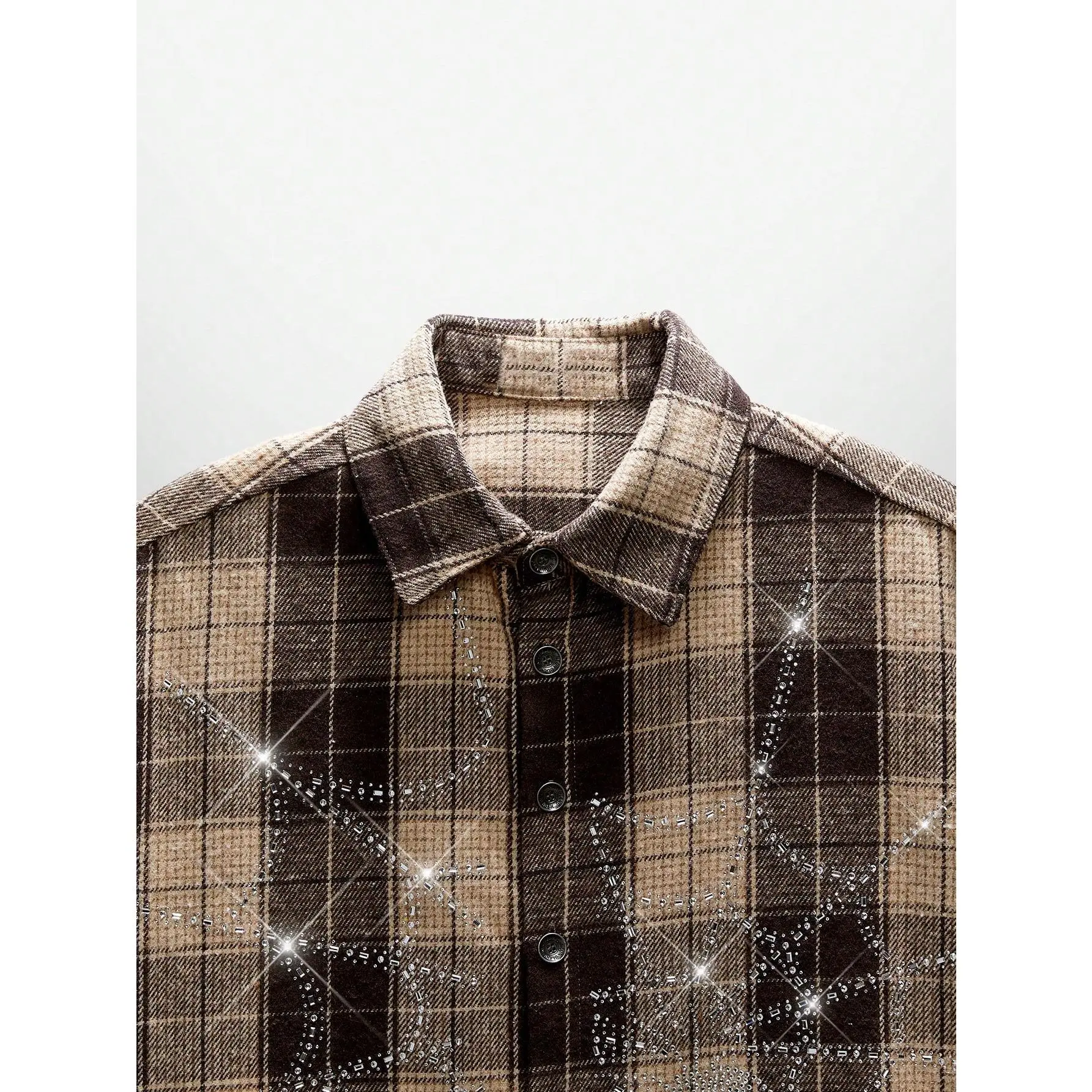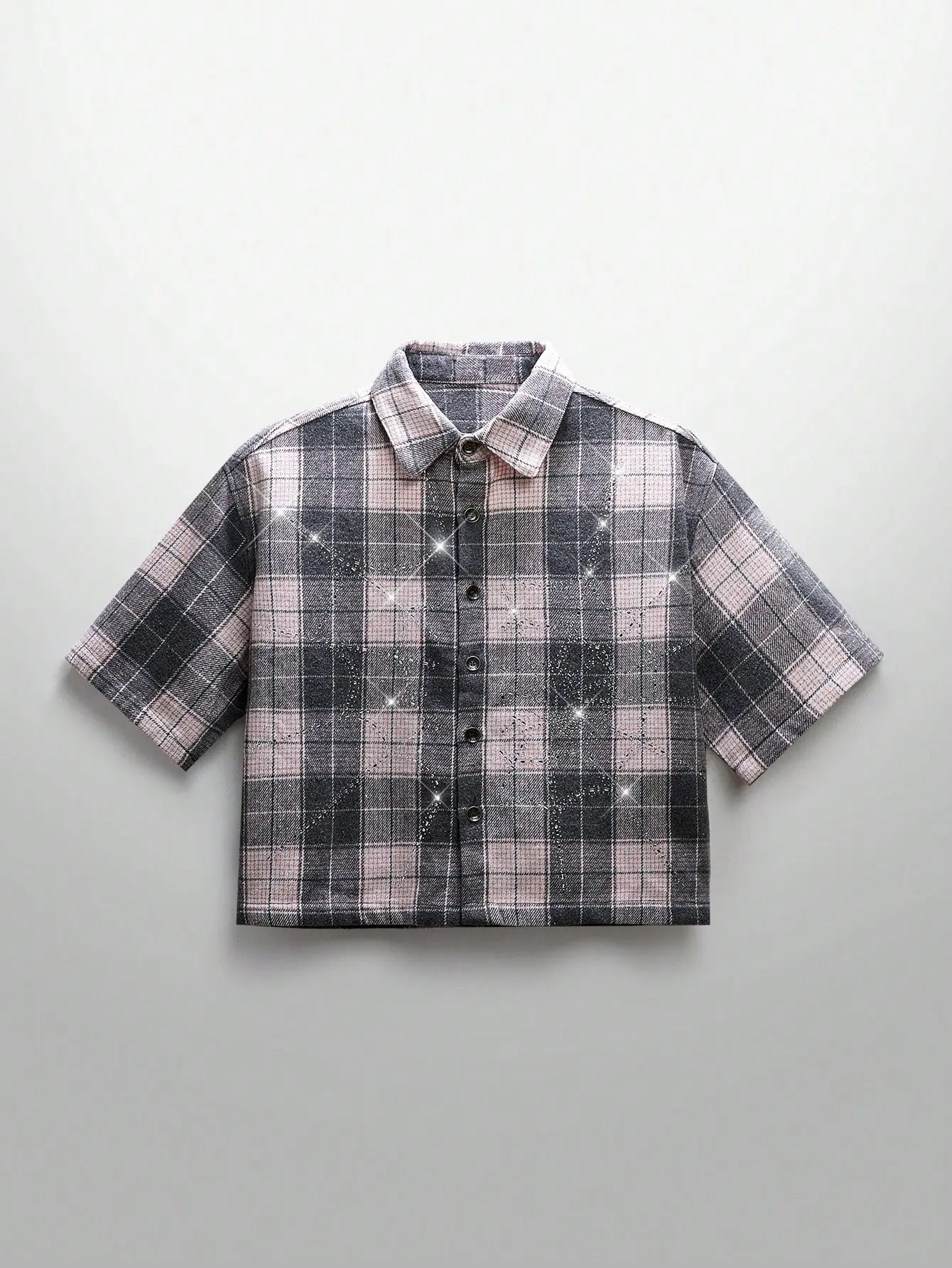 【Order Size Up】Unisex Spring Summer Glitter Street Style Crystal Spider Web Plaid Short Sleeve Woven Shirt