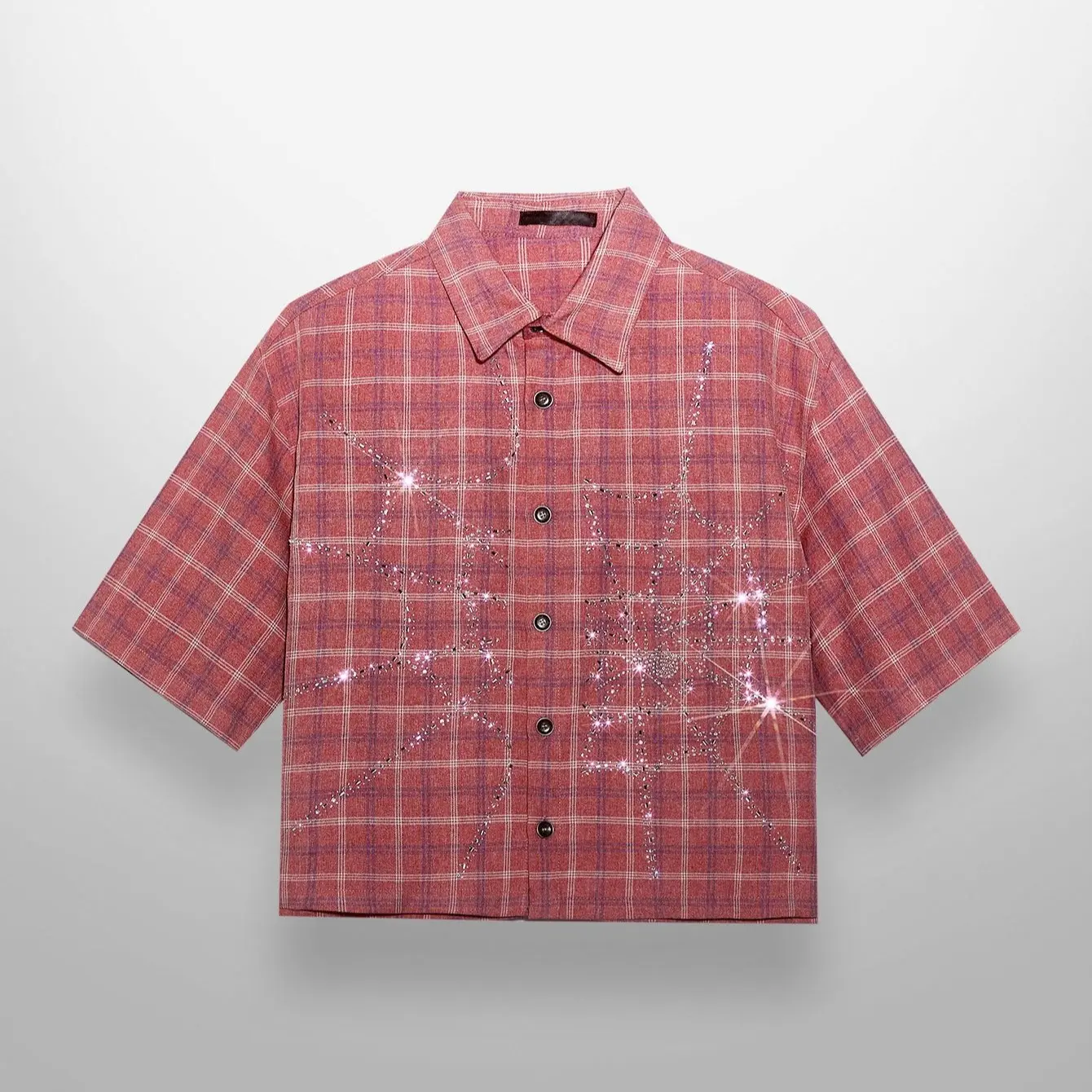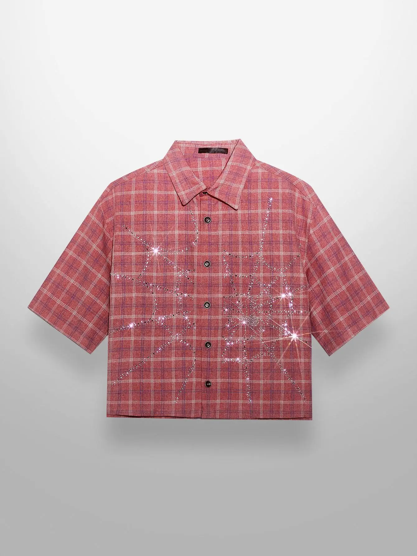 5. 【Order Size Up】Unisex Spring Summer Glitter Street Style Crystal Spider Web Plaid Short Sleeve Woven Shirt