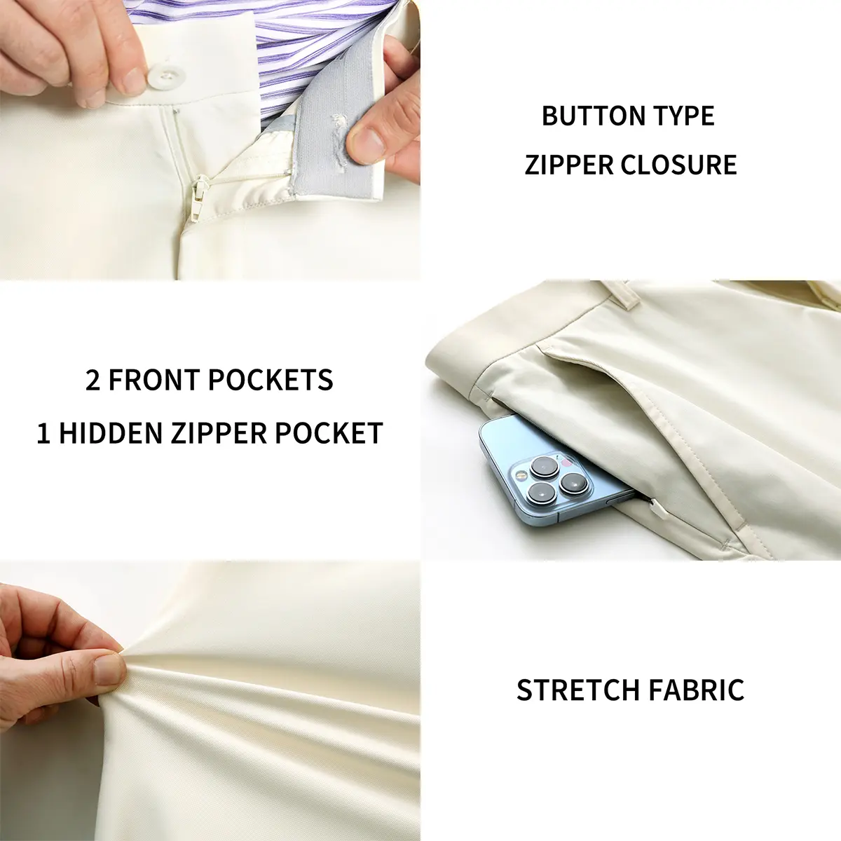 ·5 POCKETS: This men's golf pants provide you with greatest convenience, it has 5 deep pockets, including 2 front pockets, 2 welt back pockets and 1 right hidden zipper pocket, so that you can carry your phone, golf ball, keys or cards.