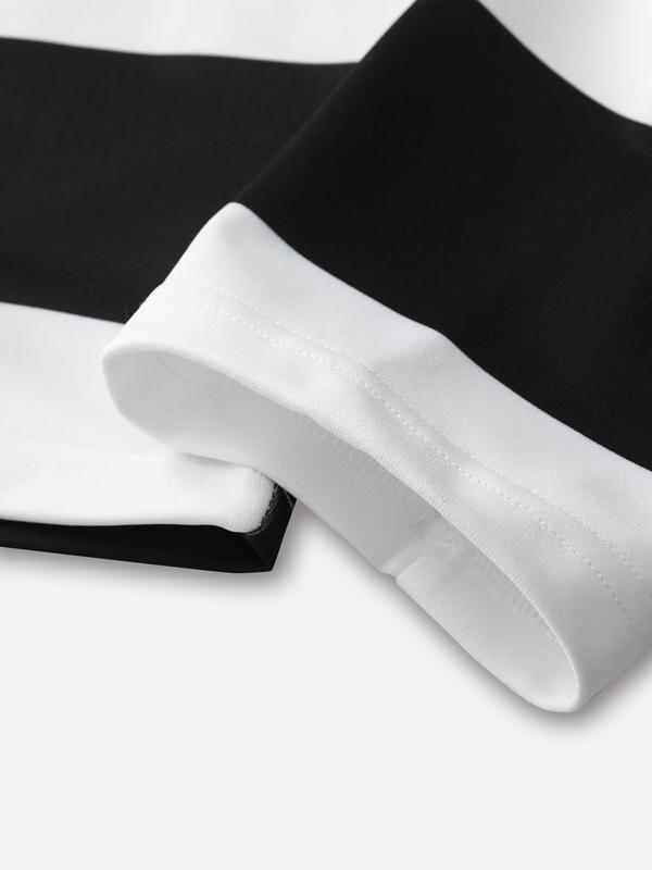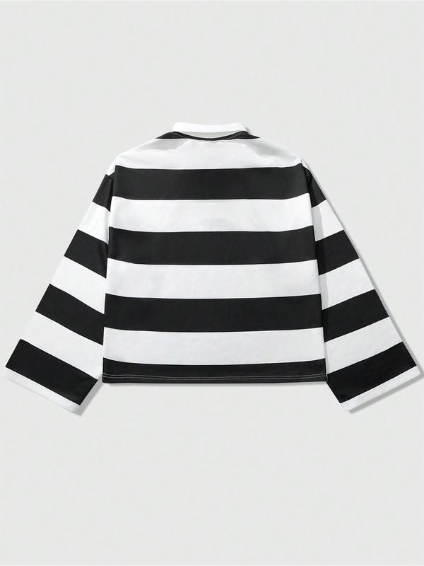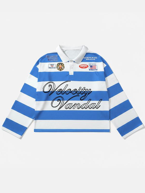 5. Men's Black and White Stripe Polo Shirt with Velocity Vandal Graphic, Streetwear Collared Shirt with Vintage Text for Casual Fashion