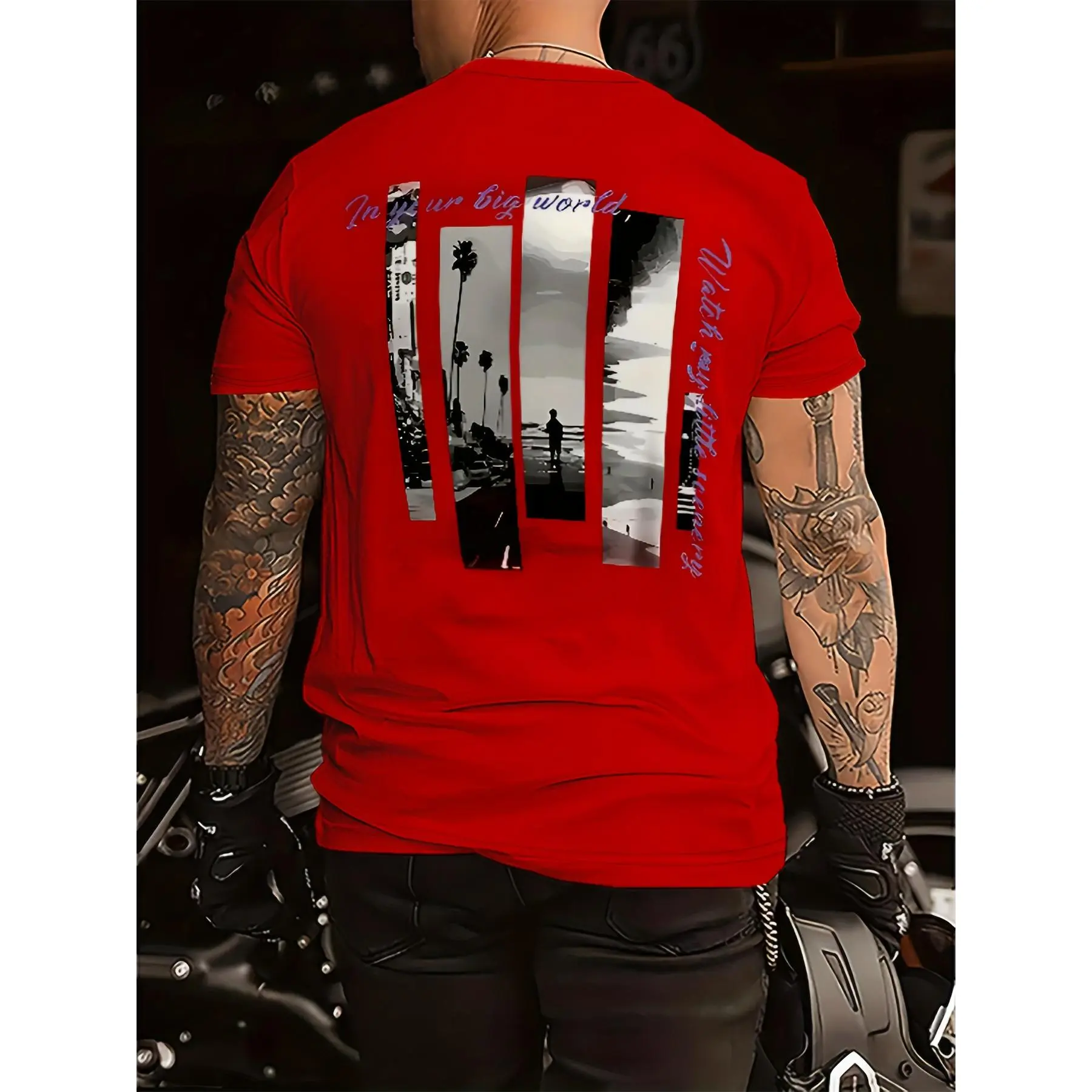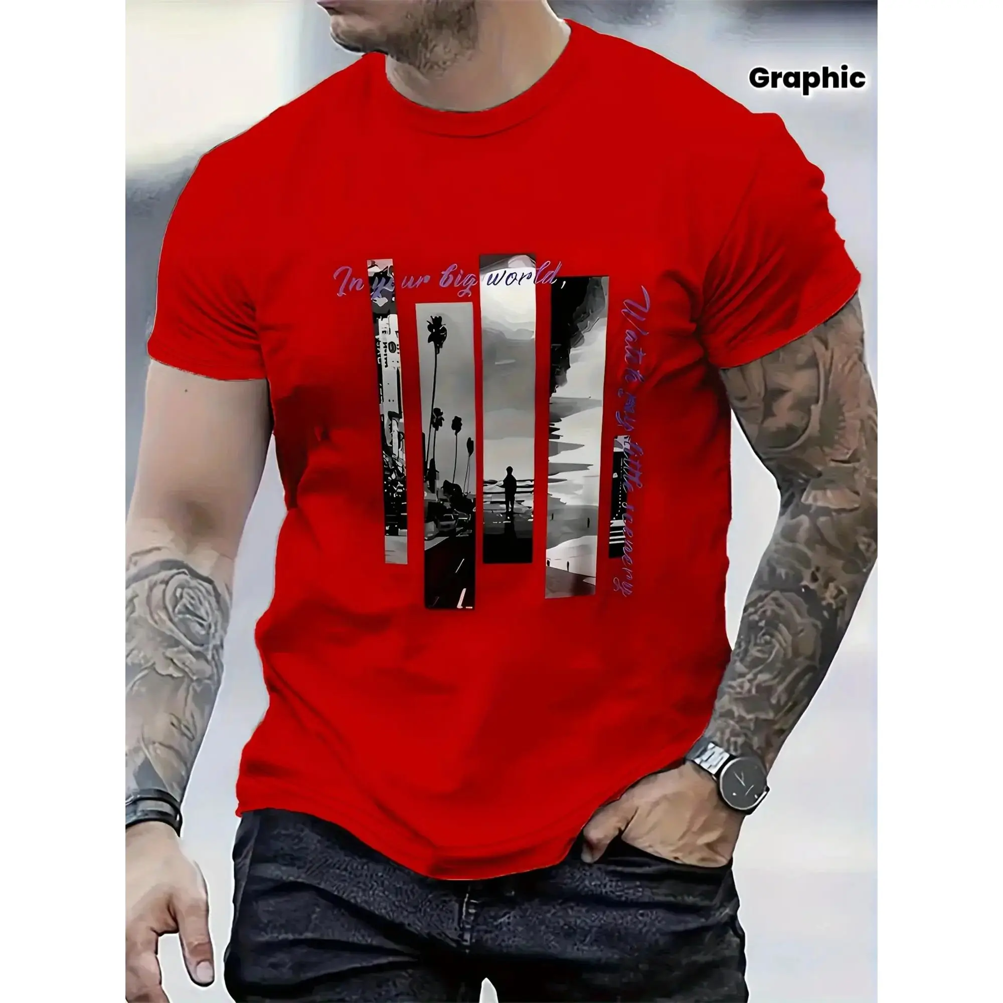 5. Men'S Stylish Red Graphic T-Shirt - , Short Sleeve Crew Neck, Comfort Fit for All Seasons, Casual Streetwear with Palm Tree & "In Your Big World" Design, Everyday Tshirt | Bold Graphic Tee | Smooth Texture Fabric graphic tee