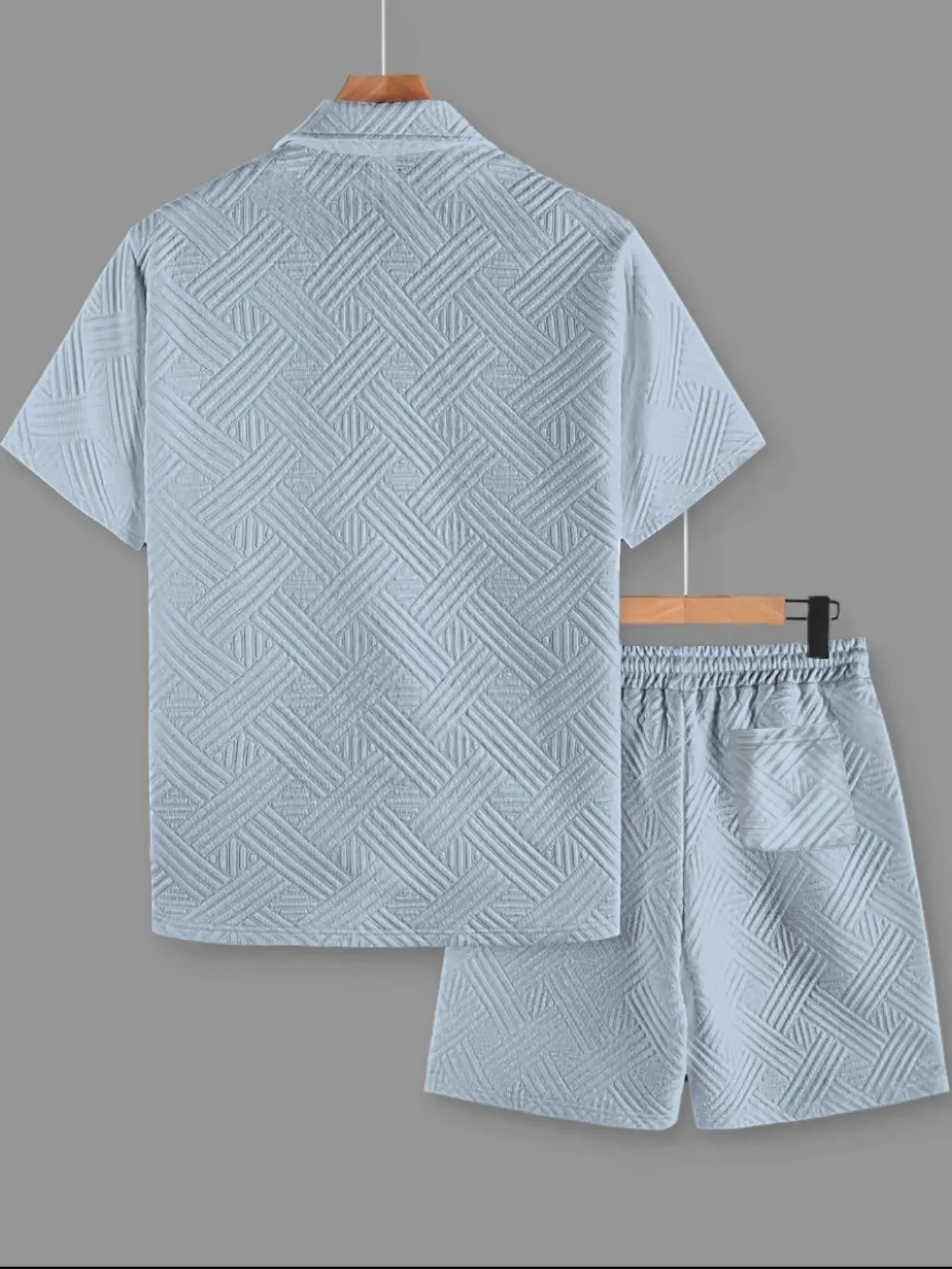 Men's 2-piece set:a short-sleeve button-up shirt paired with drawstring shorts. This summer outfit features a casual, Tropical textured diagonal stripe pattern, perfect for beach getaways, vacations, casual outings, and more—a men's stripe set.