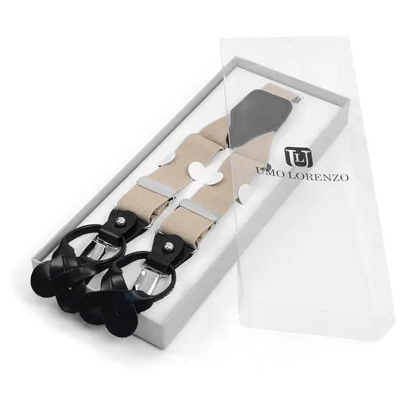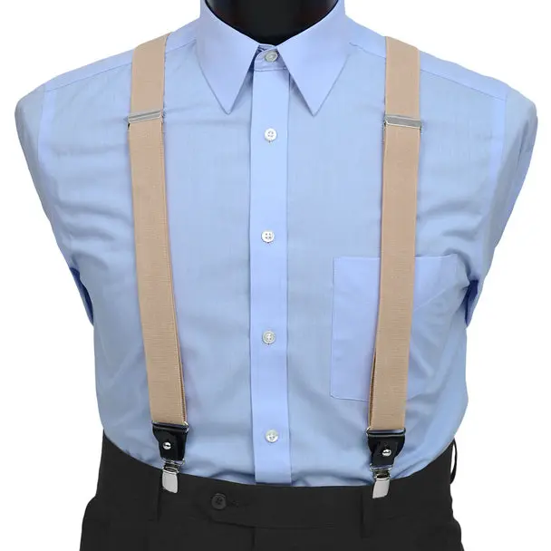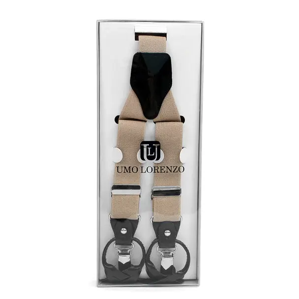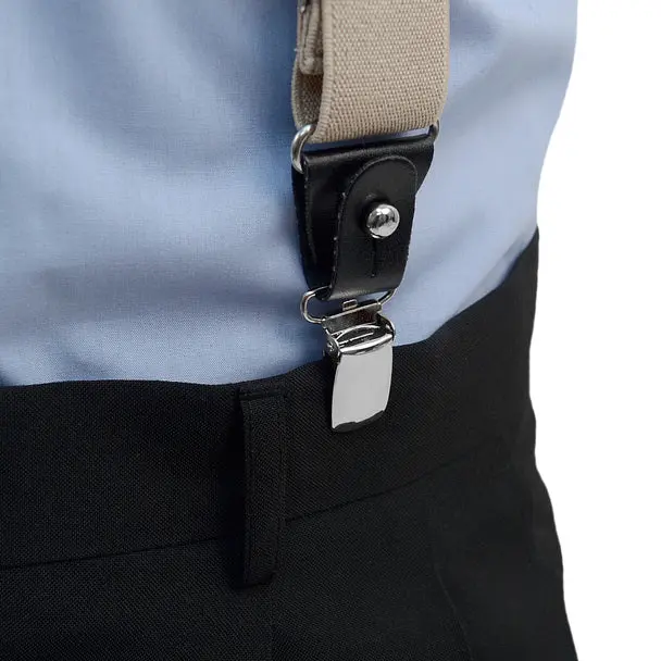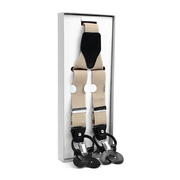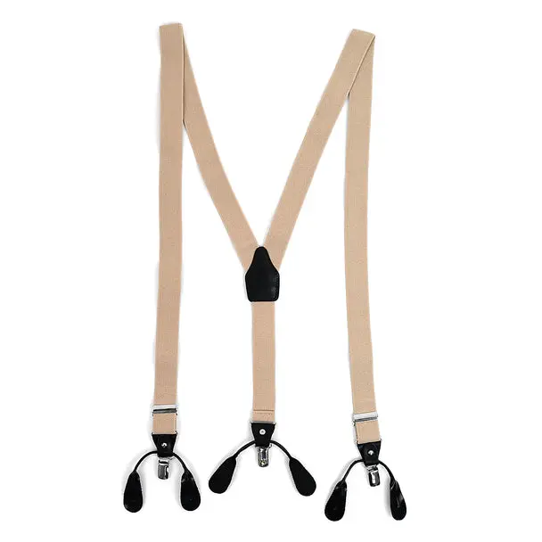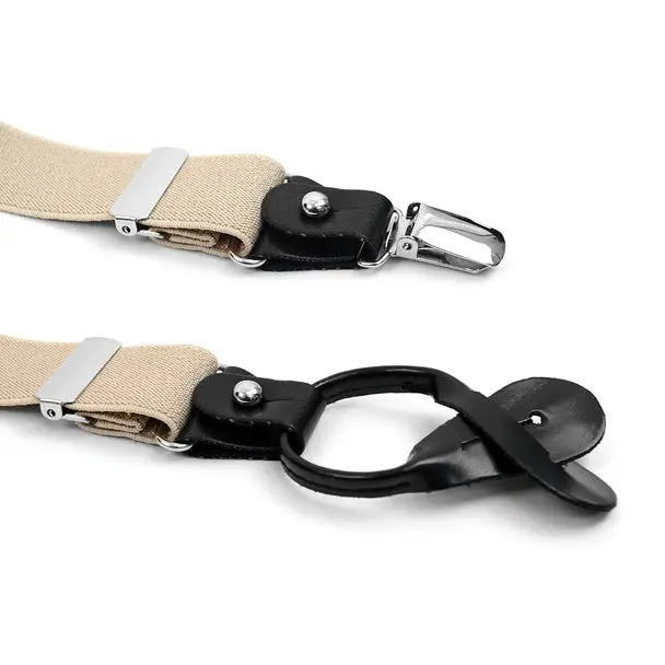These Convertible suspenders offer the option of wearing them the traditional way with leather button straps, as well as, an easy clip-on alternative. The straps themselves are an elastic material to get a perfect and tight fit. The Button straps and clips are connected by leather trim that can be unfastened to remove either the buttons straps or clip-ons.