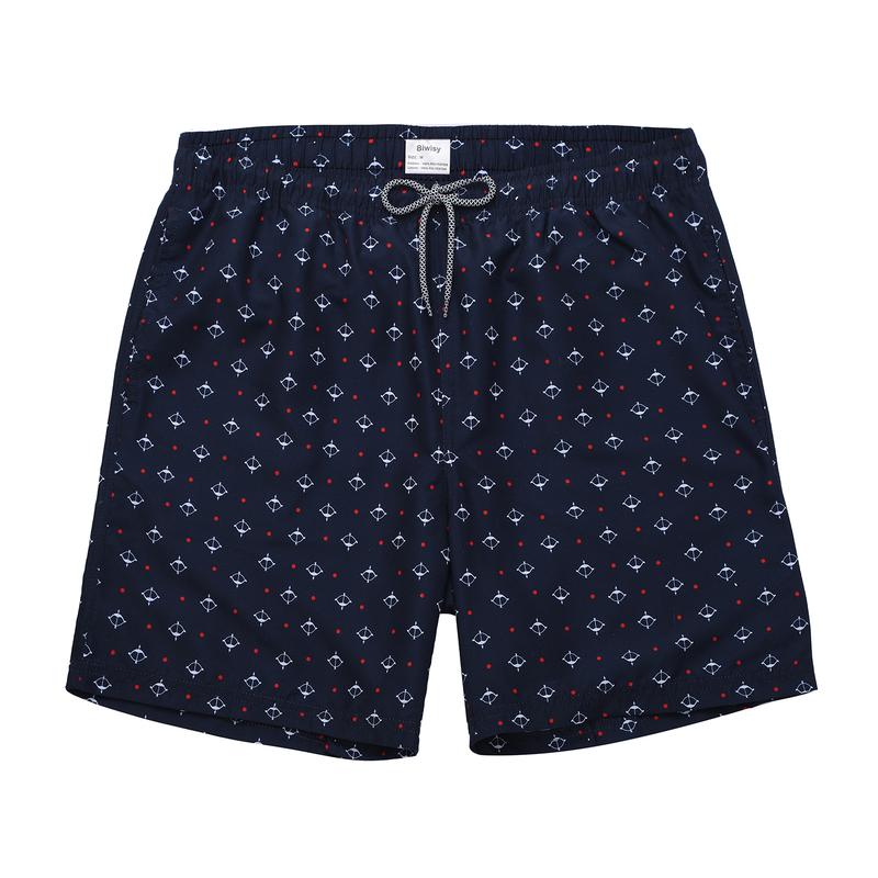 · quick dry swim trunks - 100% polyester; this men's beach trunks made of quick drying fabric, lightweight, comfort, excellent ability of water repellent ( not waterproof ) . high quality and colorful print mens swim trunks, never fade, no peeling.