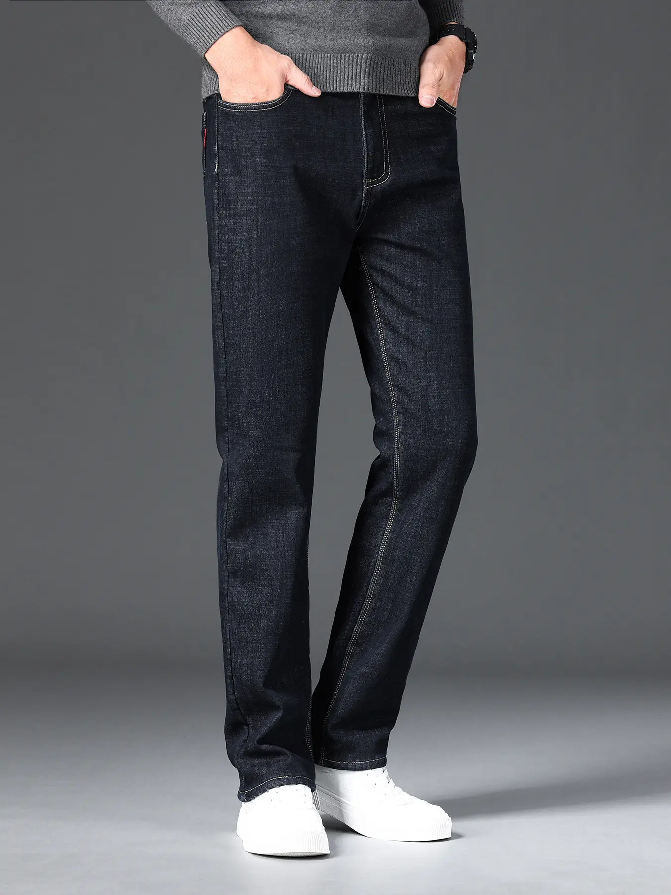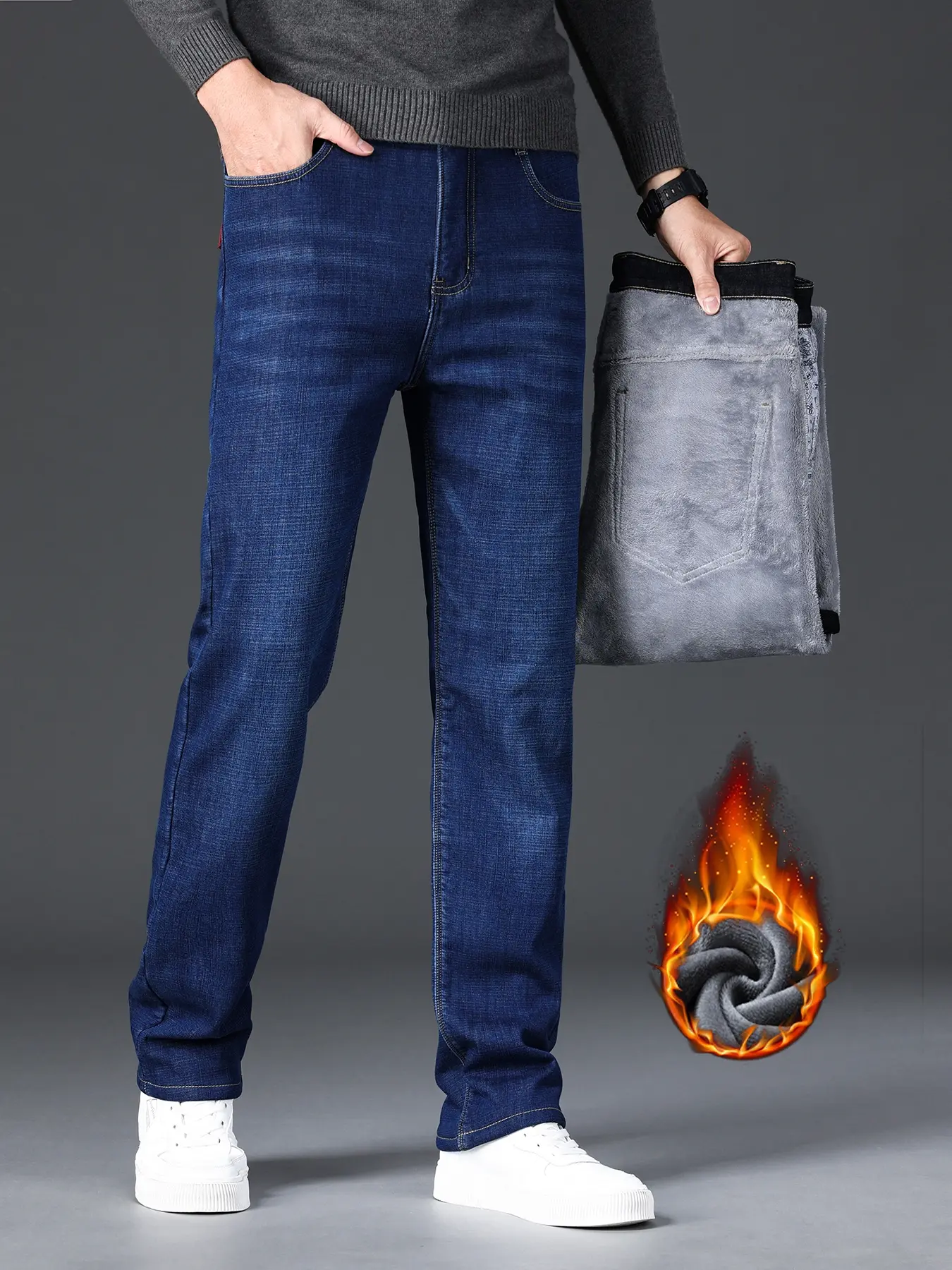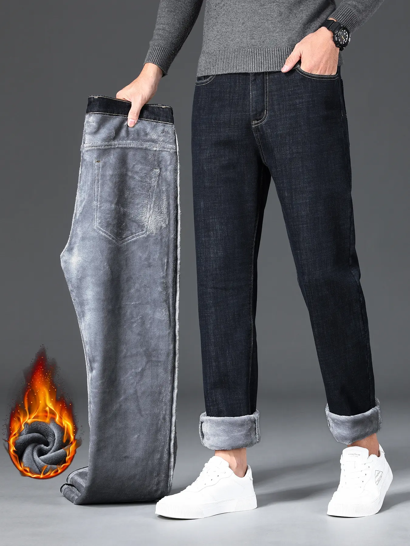 Men's Thickened Winter Fleece Jeans, Hi Rise Jeans, Loose Straight Leg High Waist Casual Elastic Pants, Warm Long Denim Trousers for Fall & Winter