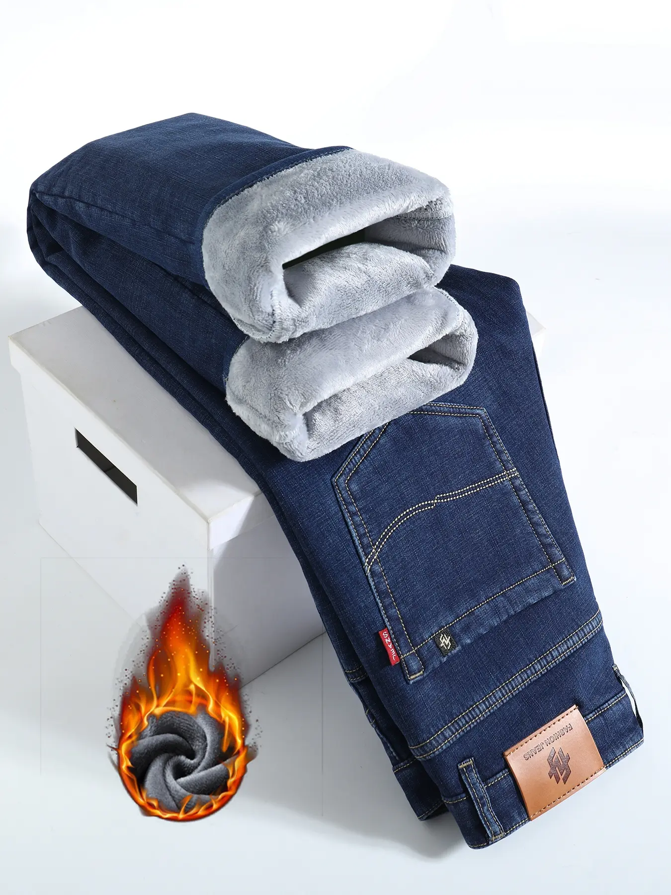 5. Men's Thickened Winter Fleece Jeans, Hi Rise Jeans, Loose Straight Leg High Waist Casual Elastic Pants, Warm Long Denim Trousers for Fall & Winter