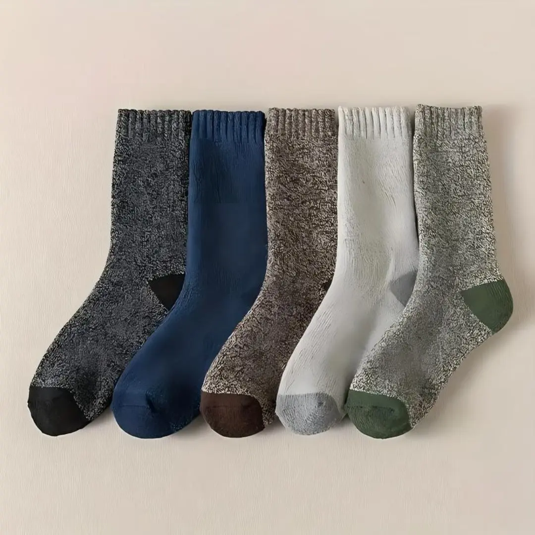 Men's Thickened Warm Winter Socks 5 Pairs Pack: These socks come in a convenient pack of 5 pairs, perfect for cold weather. ️ Soft and Comfortable: Made from a blend of polyester and elastic, these socks offer softness and comfort. Knitted Round Design: The round design ensures a snug fit, keeping your feet warm and cozy. Ideal for Cold Weather Thickened for Warmth: These socks are thickened to provide extra warmth during cold weather. ️ Versatile Use: Suitable for various cold weather activities, ensuring your feet stay warm and comfortable.